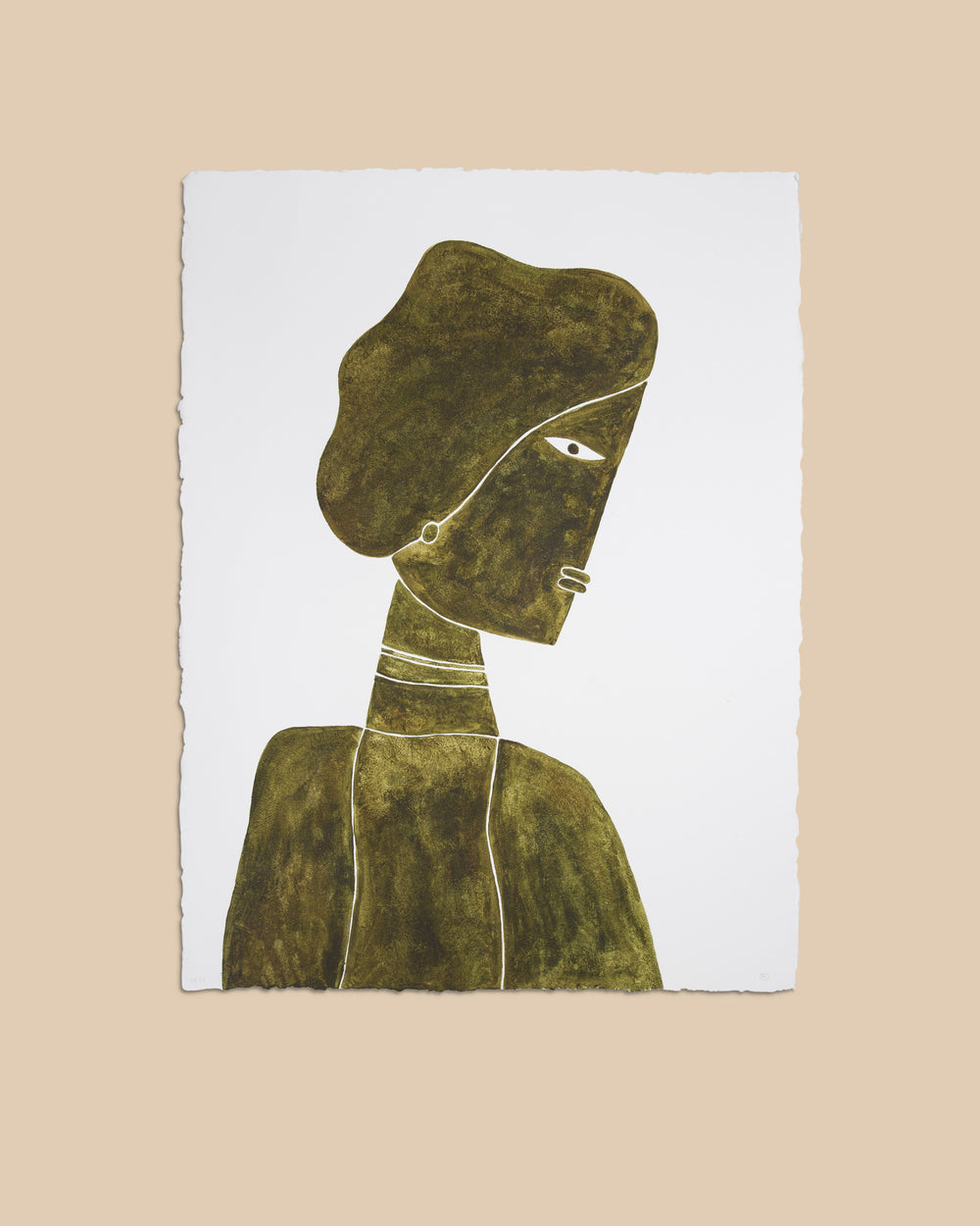 Created in Spring 2023, Lady Green Djambo watercolor on paper in green-hued earth tones is a one of a kind piece. For Framing Options please email info@arje.com