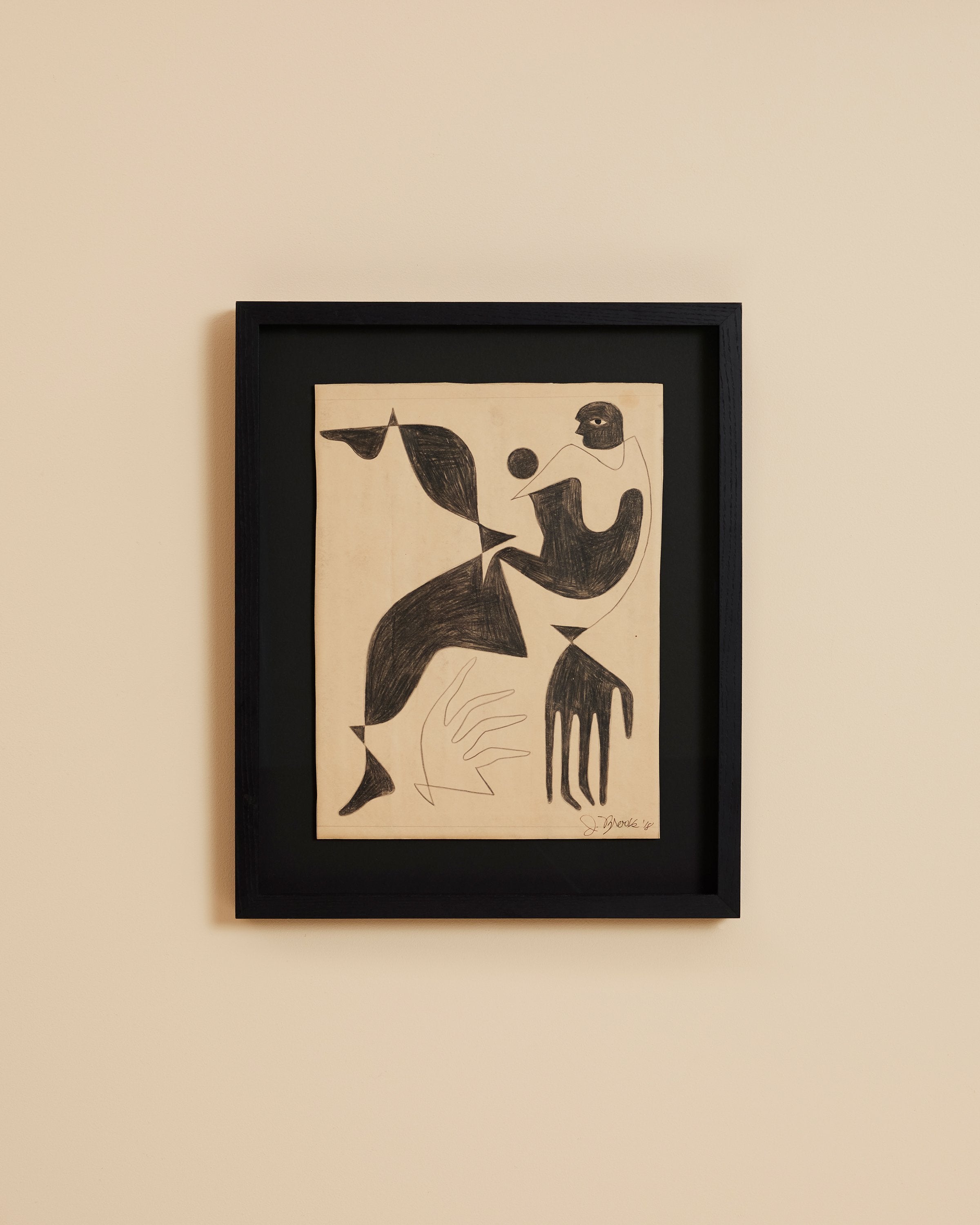 This one of a kind framed graphite on vintage paper piece sold with a solid black frame and fitted with museum standard glass.