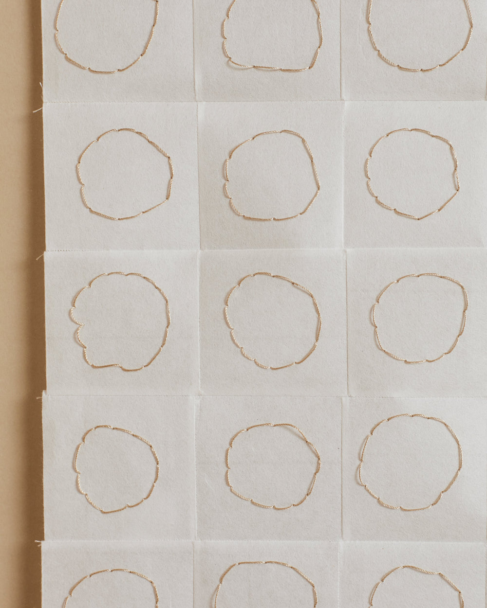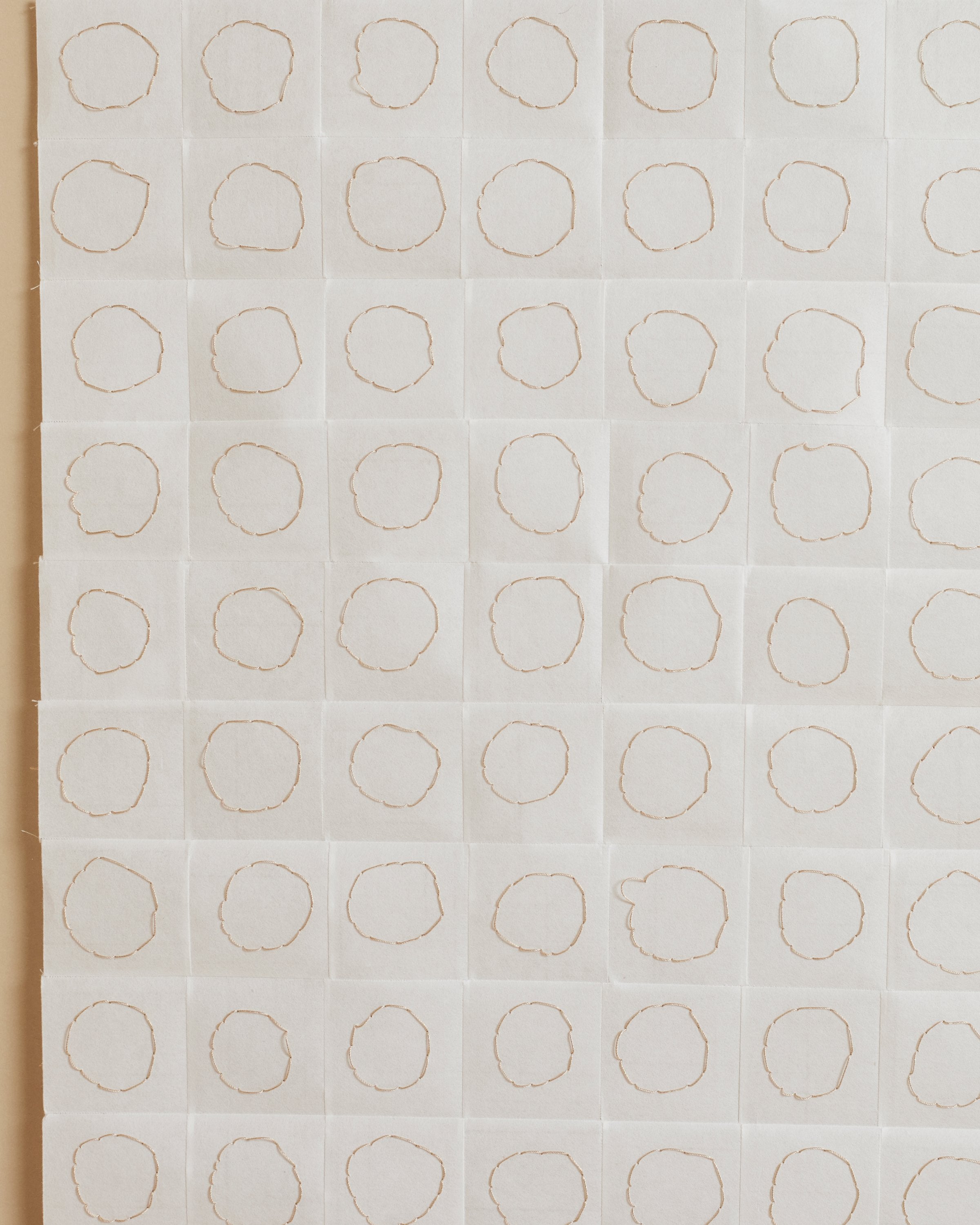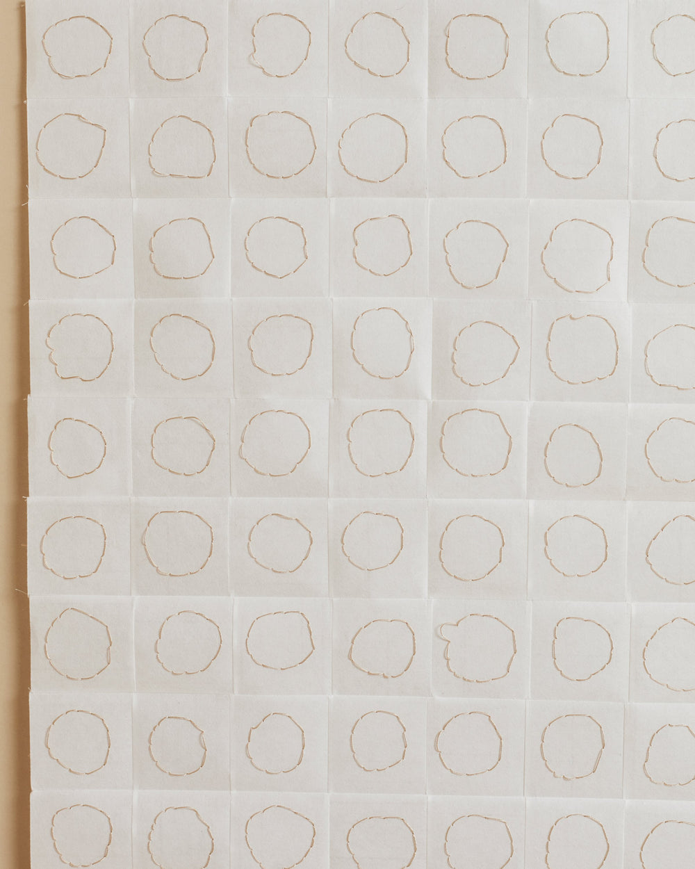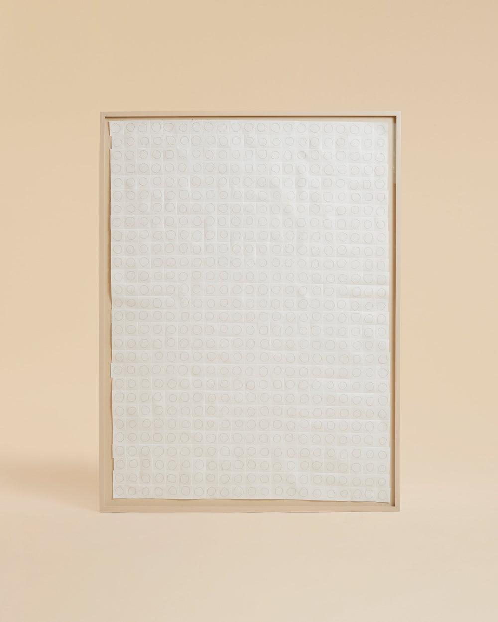 "My work is minimal, using the grid or circles as focal points in which to convey transformative atmospheres that build and aggregate to evoke moods and resonances; places wherein something we have yet to encounter feels intensely familiar," she says. Edgar's works embrace inconsistencies of the human hand and the visual pleasures found in error-derived variation. Untitled I is paper collage art that uses black silk thread on white Kozo paper and is one of a kind, created exclusively for ARJÉ. The paper-based artwork is sold with a floating frame and comes fitted with museum-standard glass.