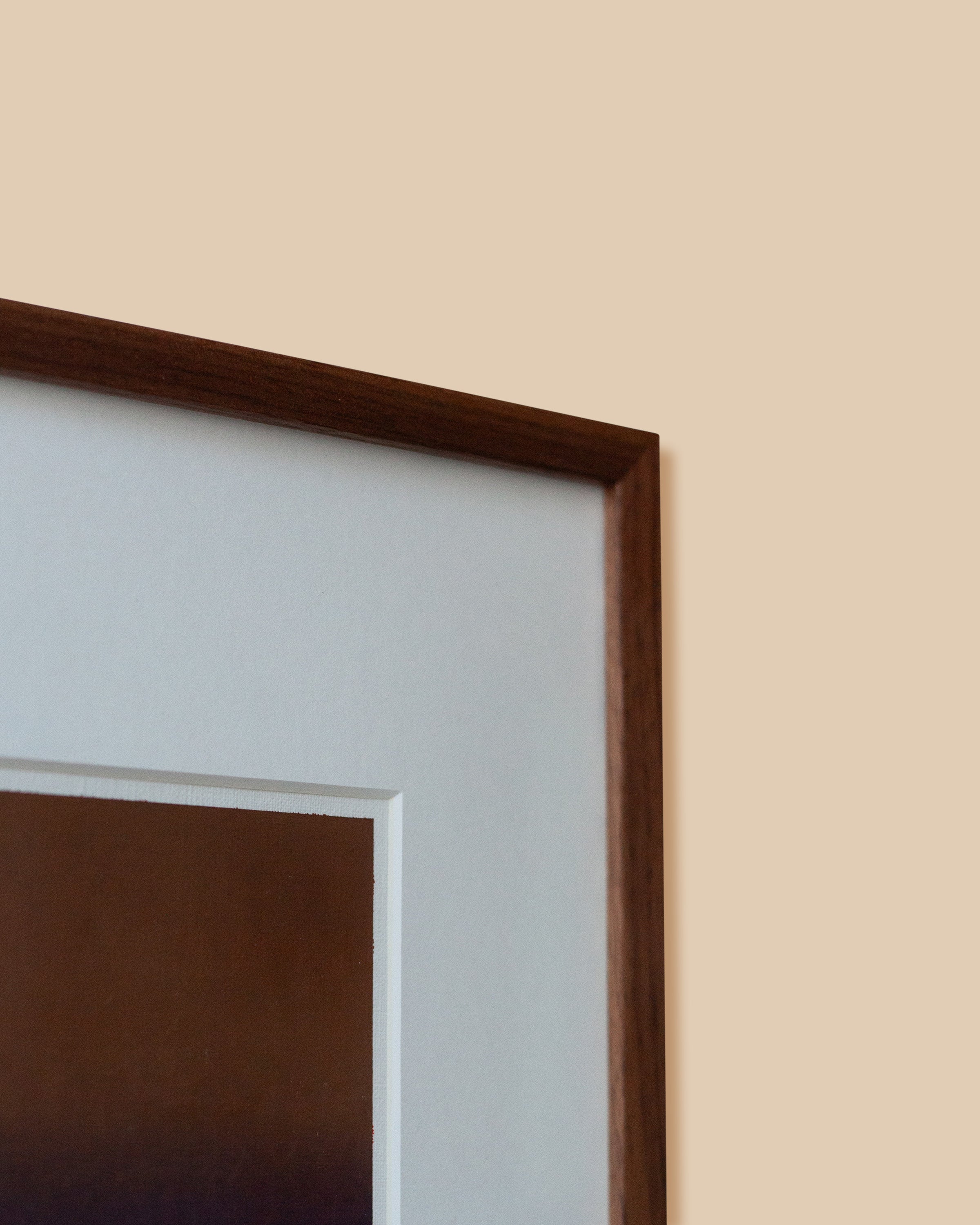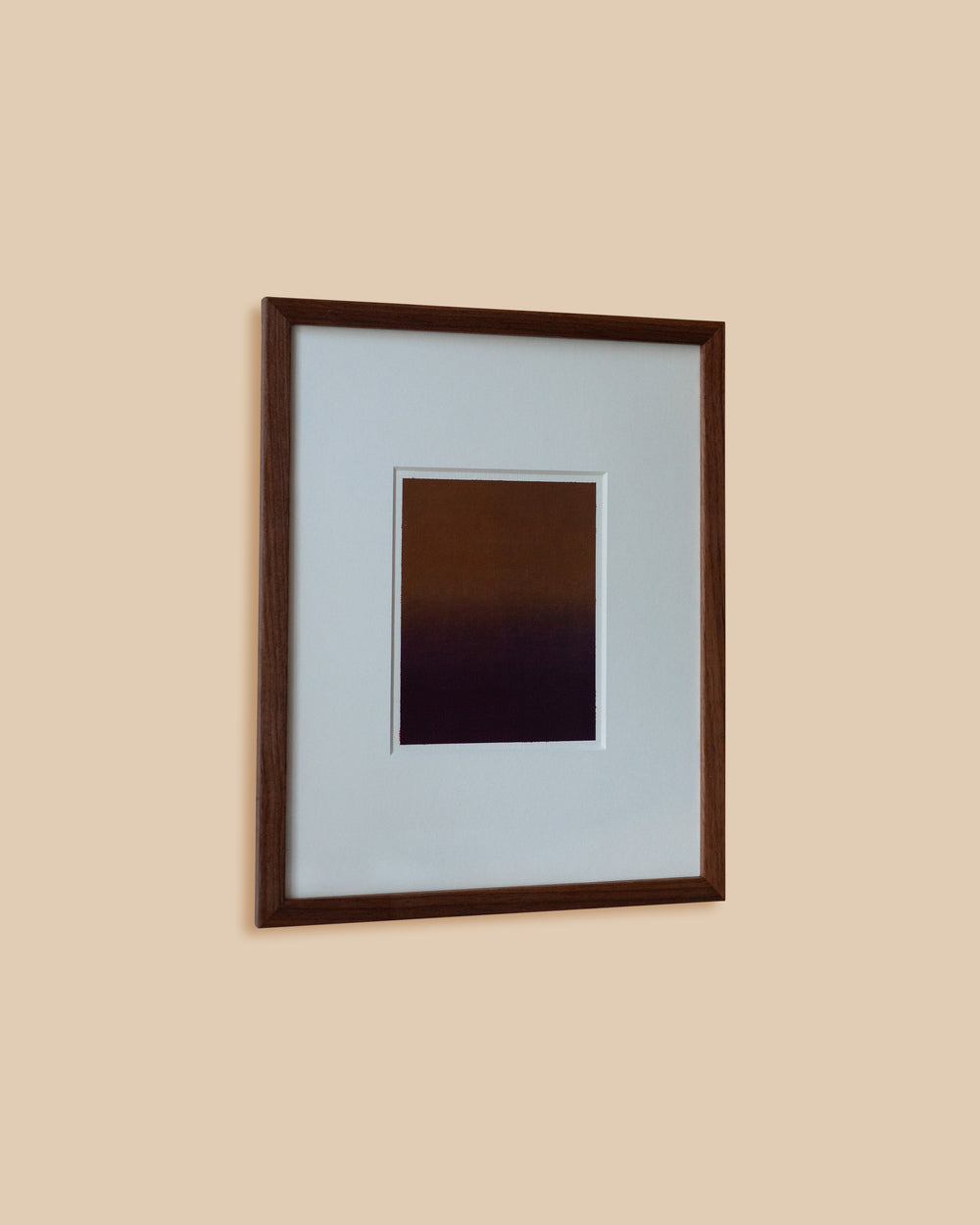 Untitled III by Stockholm-based artist Rebecca von Matérn was painted in Málaga, Spain, using acrylic on paper. This work, with its deep, warm gradient transitioning from amber to plum, embodies von Matérn’s pursuit of capturing subtle, still atmospheres. The dark walnut frame with passepartout enhances the quiet beauty of this piece, which stands alone or as part of a series. Measuring 26 x 32 cm, Untitled III reflects von Matérn’s mastery of emotion and simplicity, offering a timeless presence that resonates deeply within the Arjé curation.