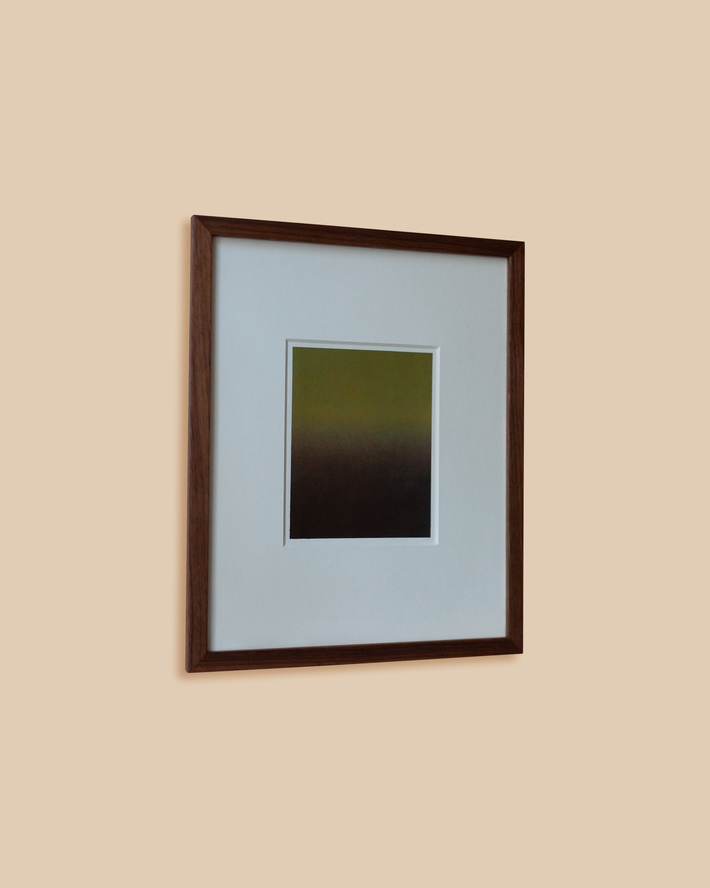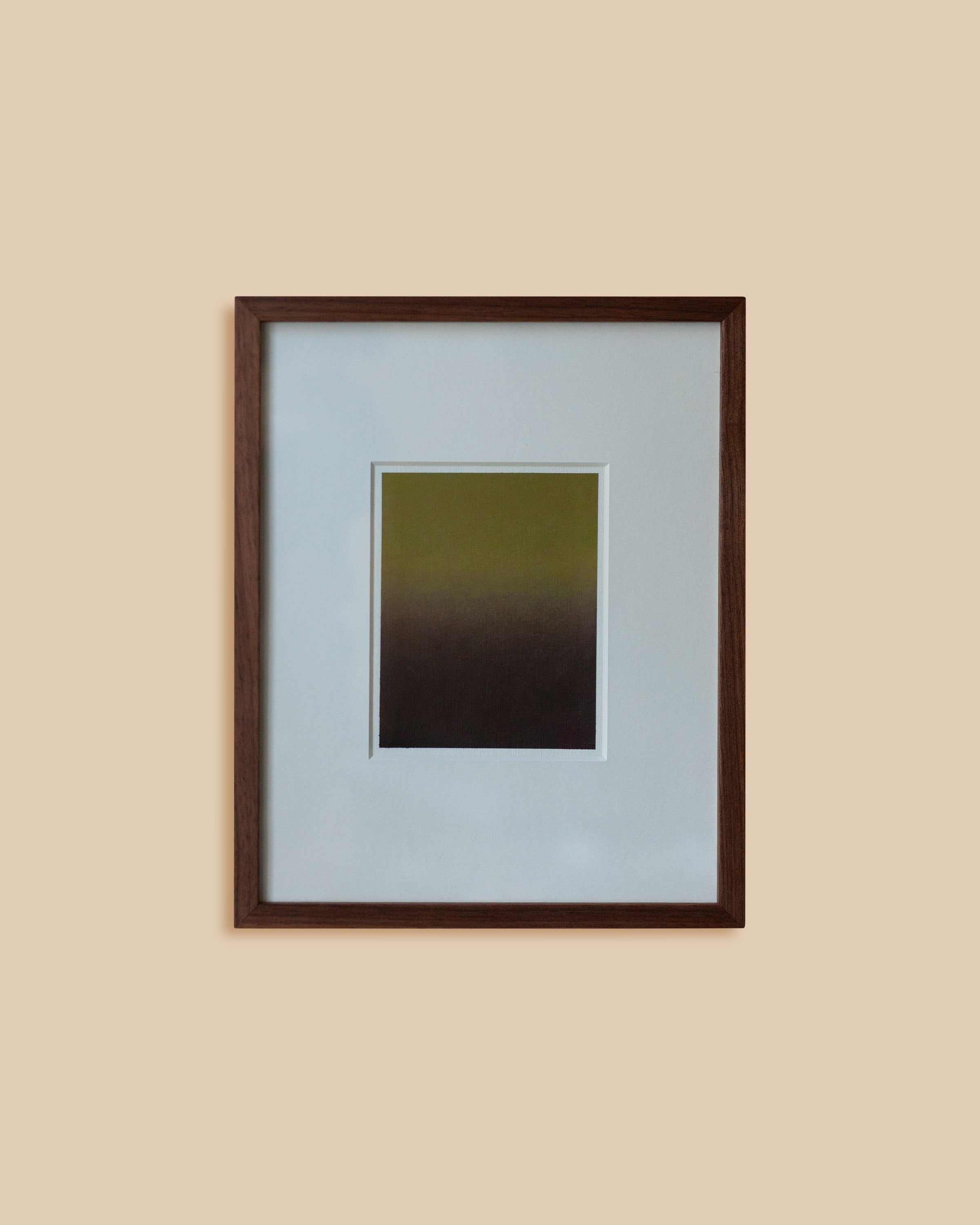Untitled VI by Stockholm-based artist Rebecca von Matérn offers a quiet gradient of olive green transitioning to deep, grounding earth tones. Created during her time in Málaga, Spain, this acrylic-on-paper work captures von Matérn’s signature ability to distill fleeting atmospheres into tangible, contemplative moments. The dark walnut frame with passepartout enhances its timeless quality. Measuring 26 x 32 cm, Untitled VI stands as a thoughtful piece on its own or within its poetic series, adding calm introspection to the Arjé curation.