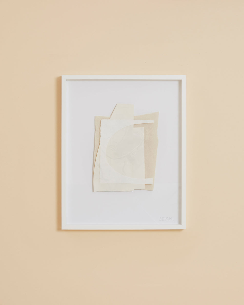 Klerk uses mixed media to create her collages—found paper and objects, sometimes photographs—that she layers and assembles together in abstract graphics rooted in texture and color composition. Created as part of an exclusive series for ARJÉ, White Noise 1 is a collage of symbolic shapes that embody the ARJÉ philosophy of mind, body and spirit.