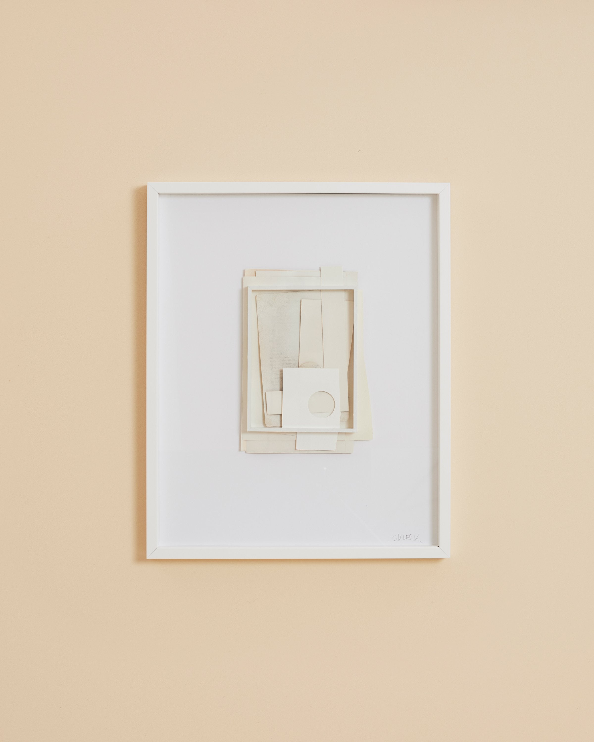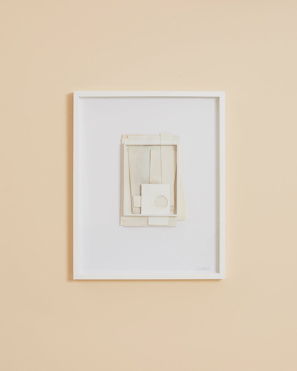 Klerk uses mixed media to create her collages—found paper and objects, sometimes photographs—that she layers and assembles together in abstract graphics rooted in texture and color composition. Created as part of an exclusive series for ARJÉ, White Noise 4 is a collage of symbolic shapes that embody the ARJÉ philosophy of mind, body and spirit.