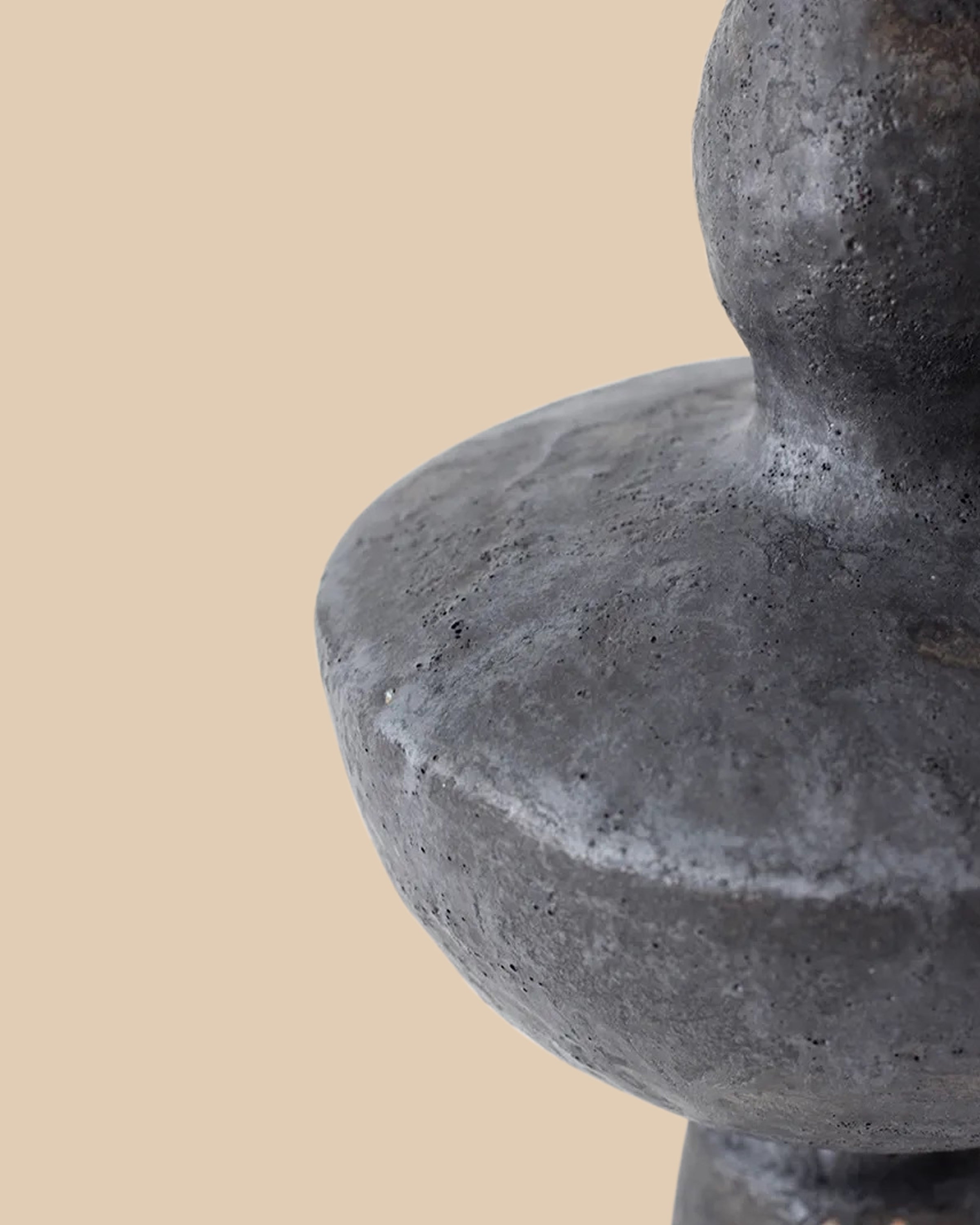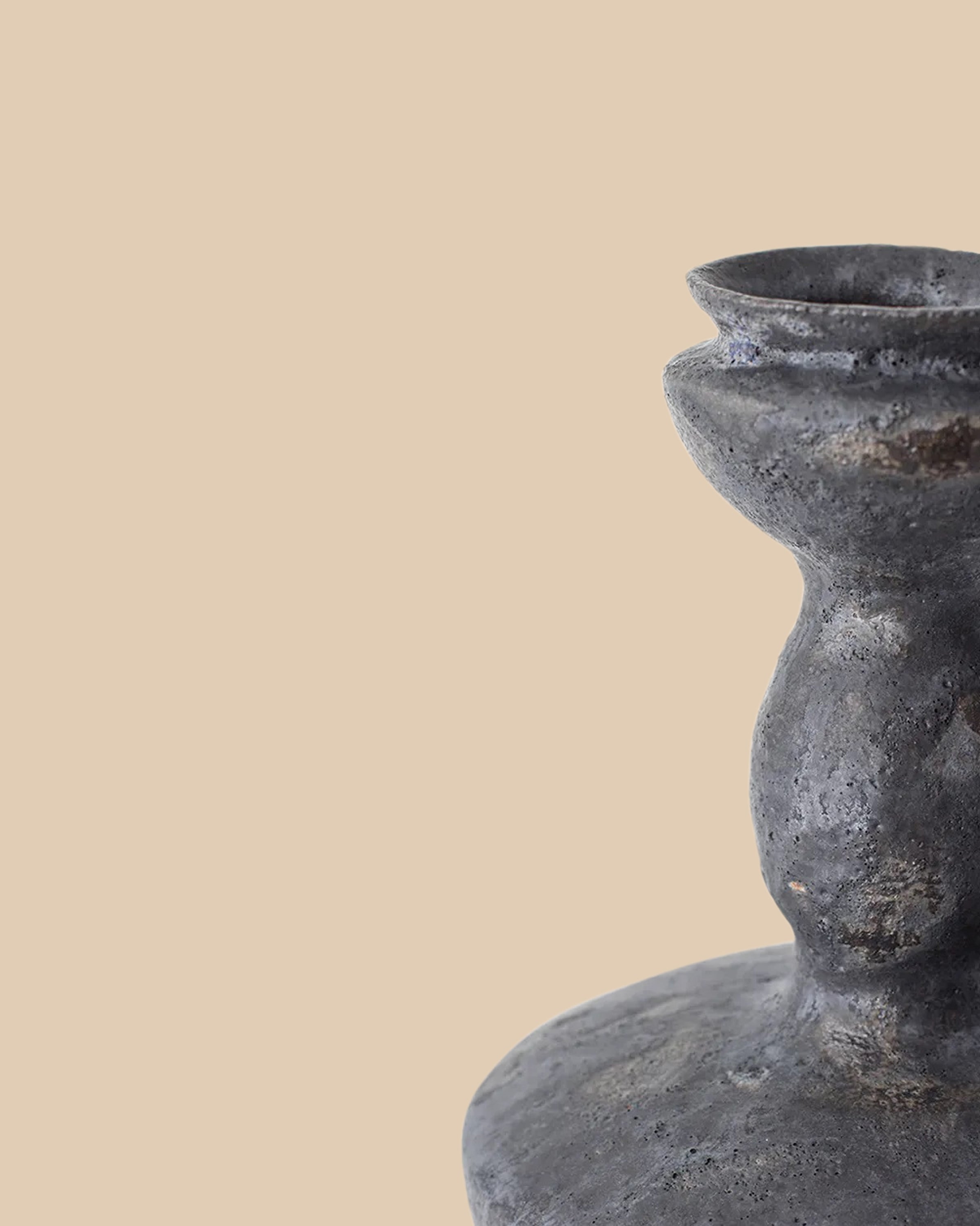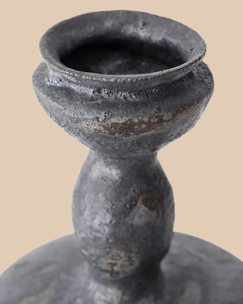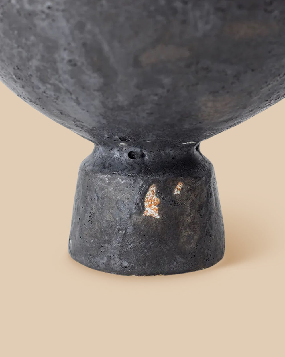The Lutróforo is an eye-catching, sophisticated decorative centerpiece that is finished in a dark glaze and handcrafted to evoke an ancient past. This glazed handbuilt vessel is made from stoneware with grog from Manises (Spain) and brushed with experimental glazes and a textured surface, resulting in slight variations with each piece. Each piece feels somehow ancient, timeless, and modern at once.