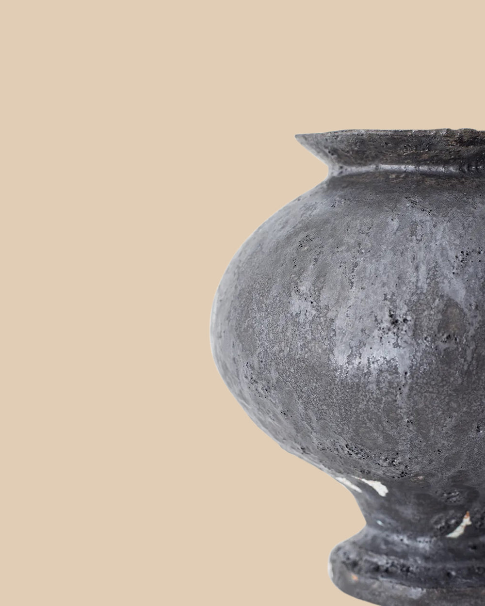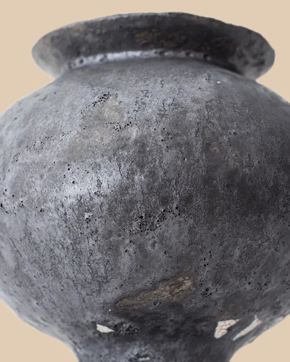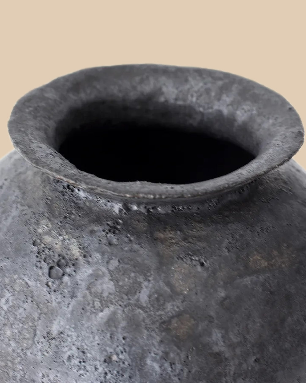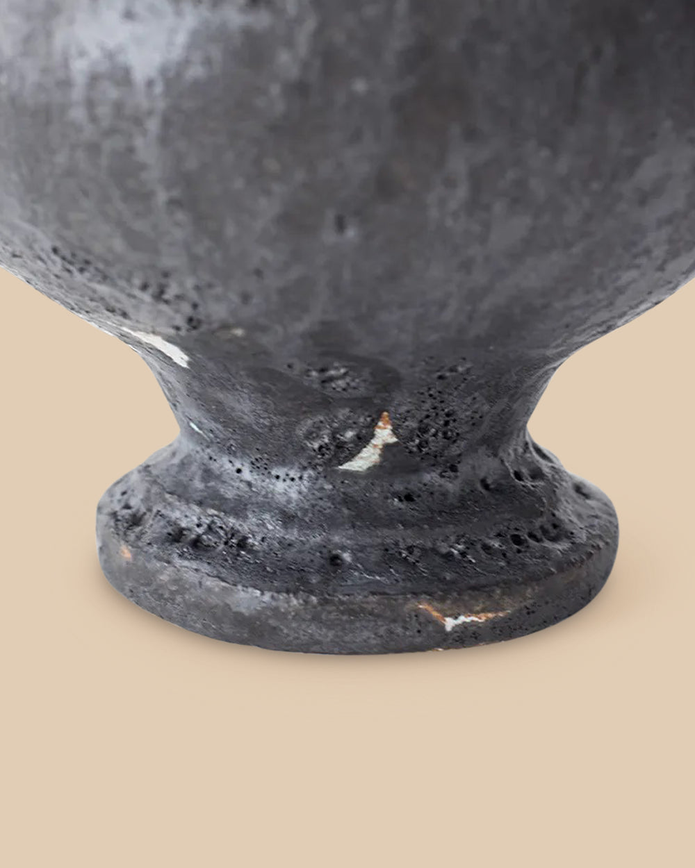 Stamnos is a glazed stoneware sculpture in Anthracite gray with a textured surface. This glazed handbuilt vessel is made from stoneware with grog from Manises, Spain and brushed with experimental glazes and a textured surface, resulting in slight variations with each piece. Each handmade ceramic vase feels somehow ancient, timeless, and modern at once.