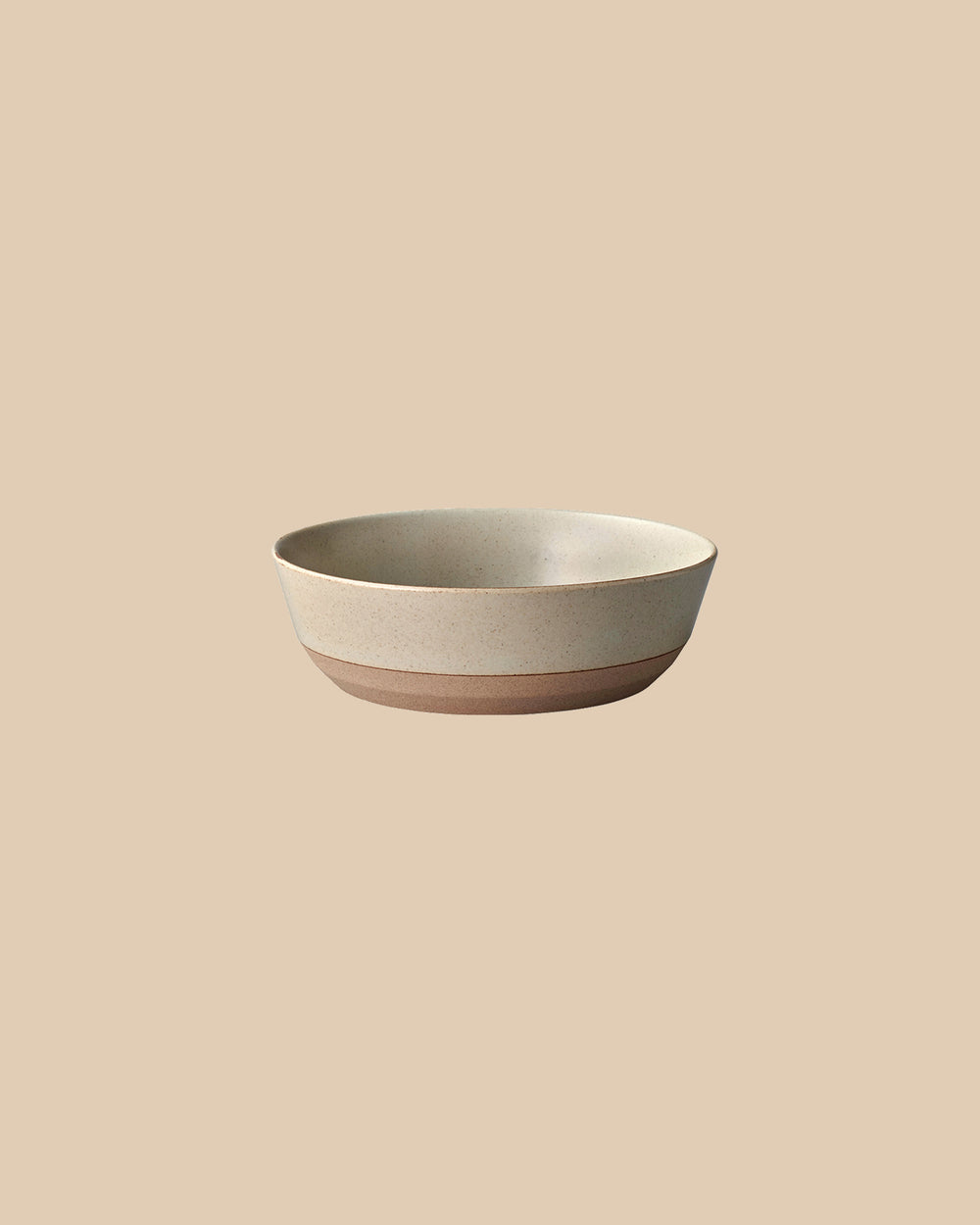 Handmade alongside craftsmen from traditional pottery villages of Japan, this large textured clay dish from Kinto juxtaposes a kind of roughness with delicacy and elegance, for a piece that's sturdy, comforting, and made to last. The refined form of this bowl is juxtaposed with a smooth beige finish.