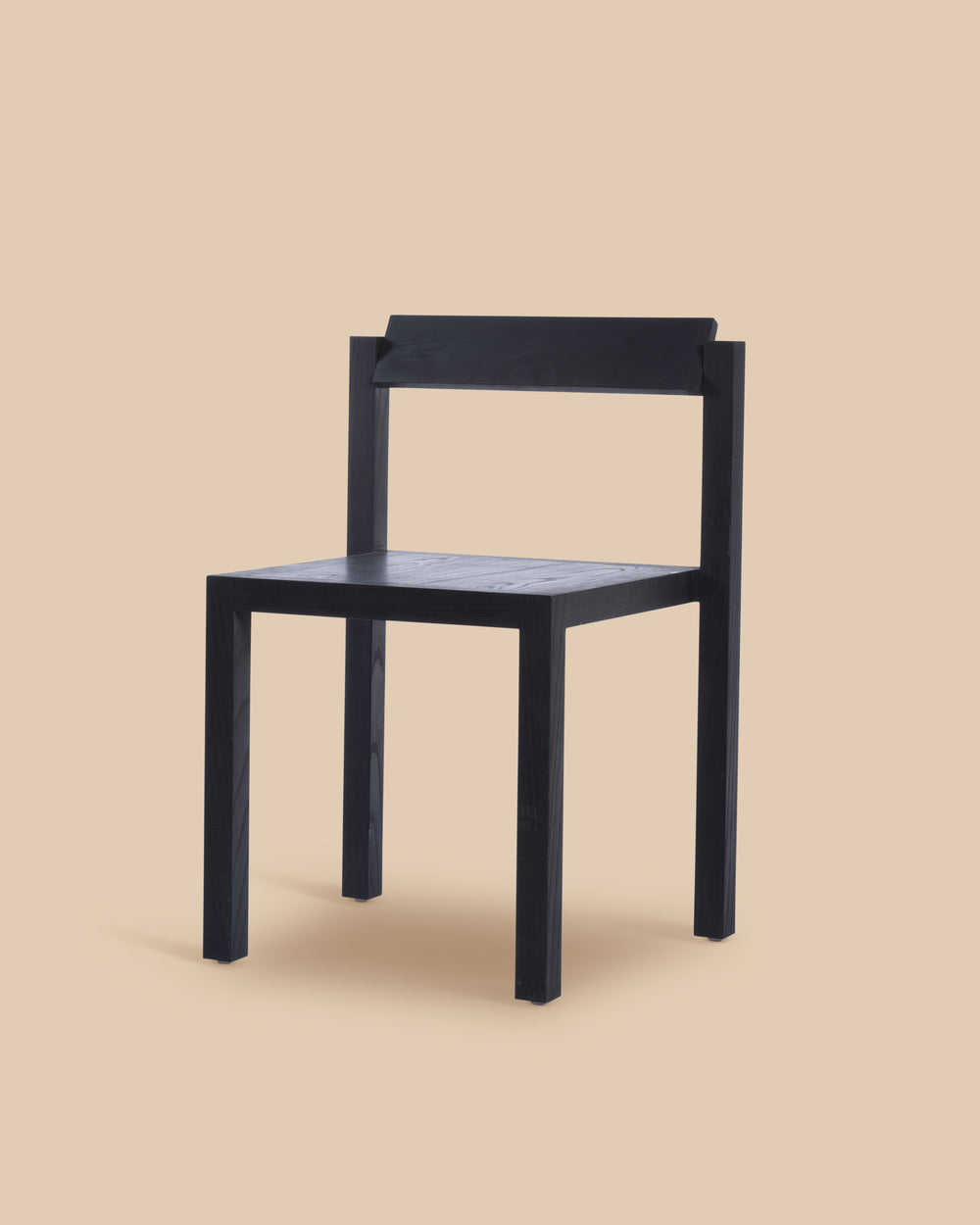 A stackable hand-built black wood dining chair with a swiveling backrest by Nicholas Bijan Pourfard made in San Diego, California. An everyday chair designed with long dinners in mind. A swiveling backrest allows you to lean back for comfort in the solid wood chair. Made to stack for easy storage.