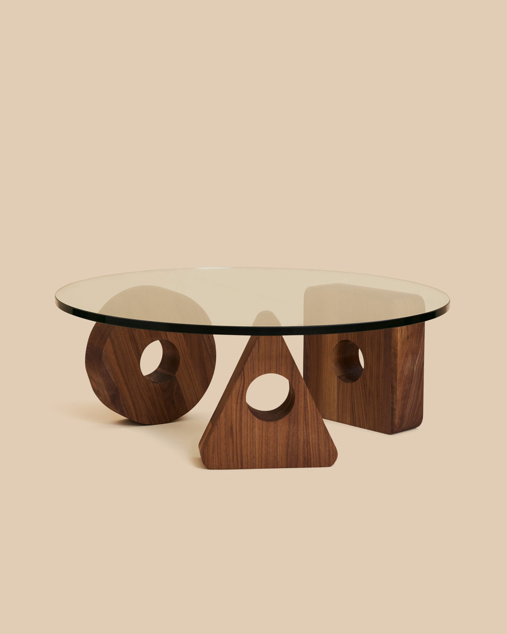 Meet Cosmo, the center of the ARJÉ furniture line. Revisiting the same symbolism as our walnut serving boards, this glass-top coffee table rests on three hand-cut, sculptural walnut silhouettes, crafted by hand in Brooklyn, NY from black walnut harvested along the North Eastern USA.
