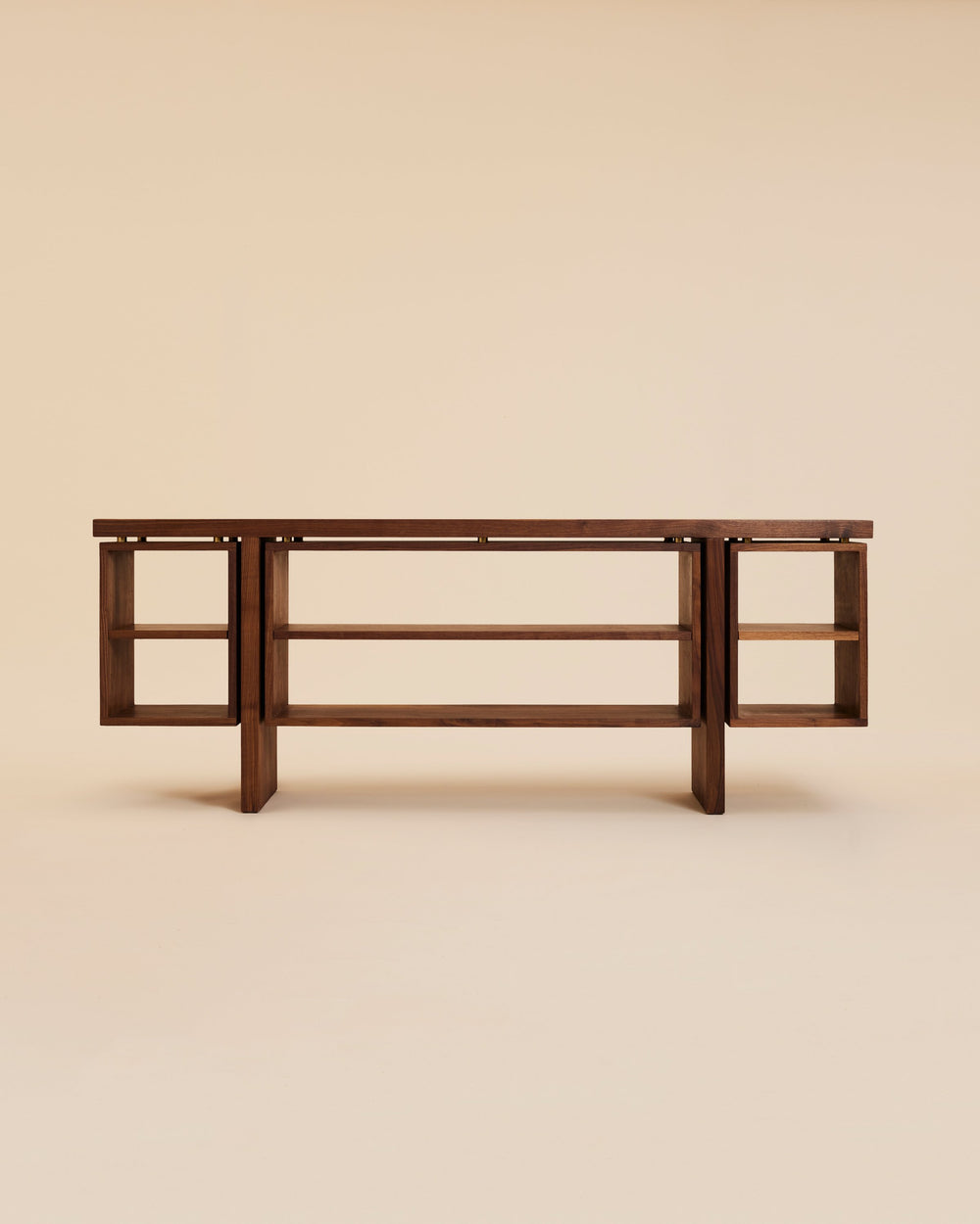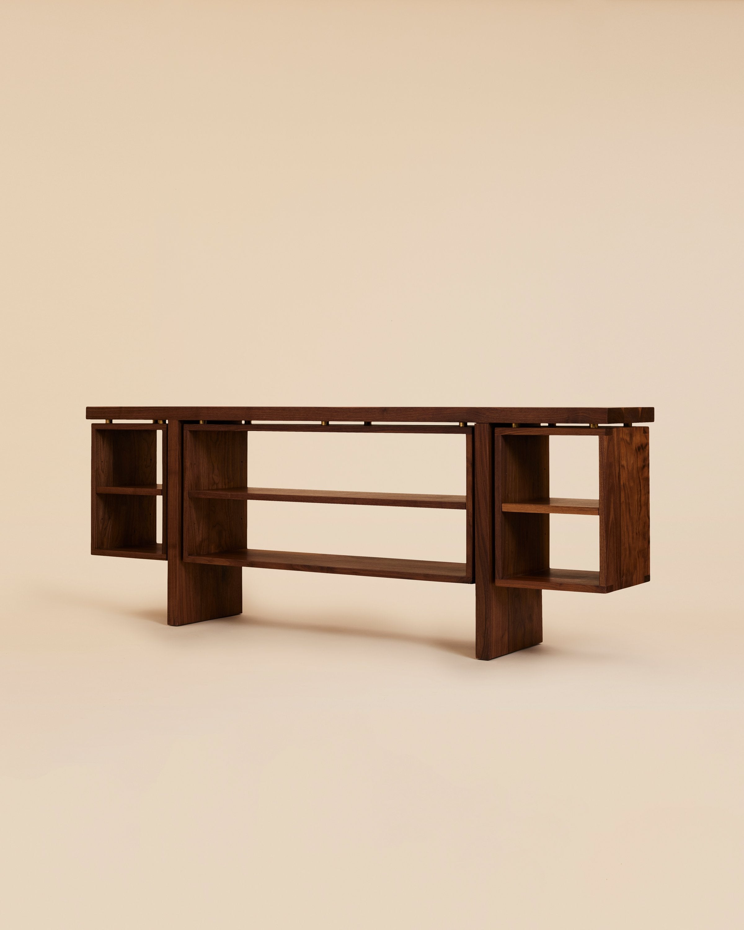 The Provost Cabinet is a premium quality walnut credenza. Made to order in Brooklyn, New York by maker Ben Kicic, this credenza, with its free floating open storage units delicately held to the frame by bronze connectors, has a light, open feel despite its robust silhouette.