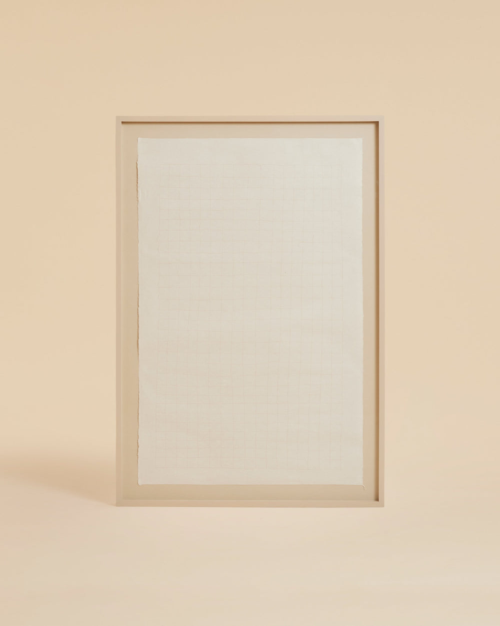 "My work is minimal, using the grid or circles as focal points in which to convey transformative atmospheres that build and aggregate to evoke moods and resonances; places wherein something we have yet to encounter feels intensely familiar," she says. Edgar's works embrace inconsistencies of the human hand and the visual pleasures found in error-derived variation. Untitled II is paper collage art that uses black silk thread on white Kozo paper and is one of a kind, created exclusively for ARJÉ. The paper-based artwork is sold with a floating frame and comes fitted with museum-standard glass.