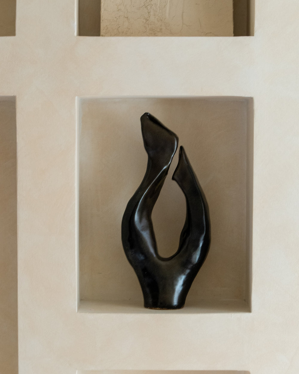 Discover Anima, a stoneware sculpture by Arjé that embodies the profound interconnectedness and uniqueness of our souls. Handbuilt with meticulous care, Anima features a fluid design where each curve and fold is seamlessly connected, yet distinct in its own right. The rich, layered glaze transitions from deep browns to ebony, creating a captivating contrast that enhances its depth.