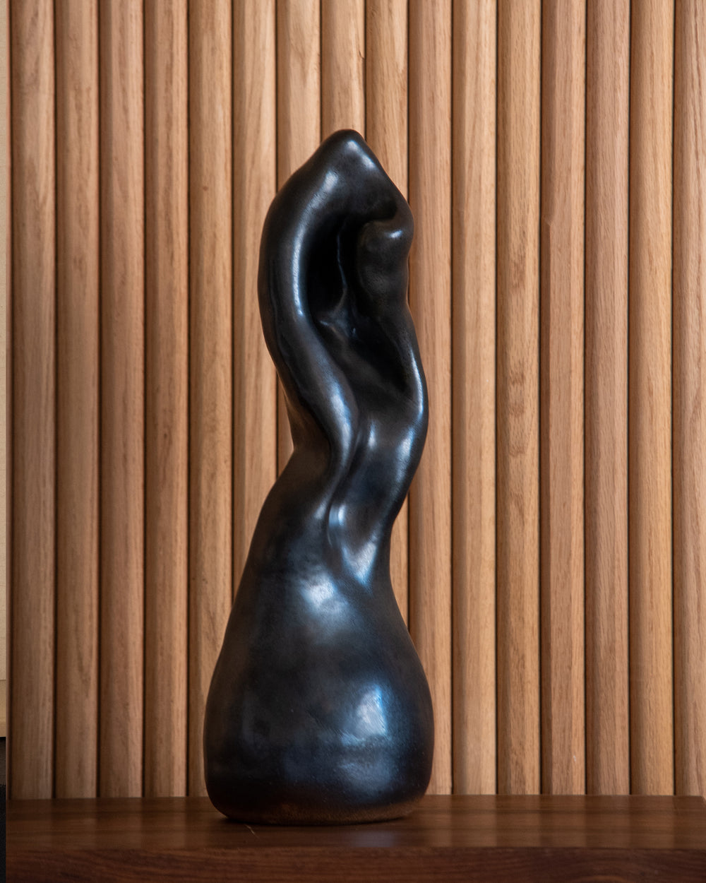 Introducing Ida, a stoneware sculpture by Arjé that captures the essence of fluidity in the female form. Hand-built with meticulous care, Ida showcases soft curves and gentle folds that evoke a sense of continuous movement. The rich, layered glaze transitions from dark browns to deep ebony, creating a captivating contrast that enhances its organic lines.