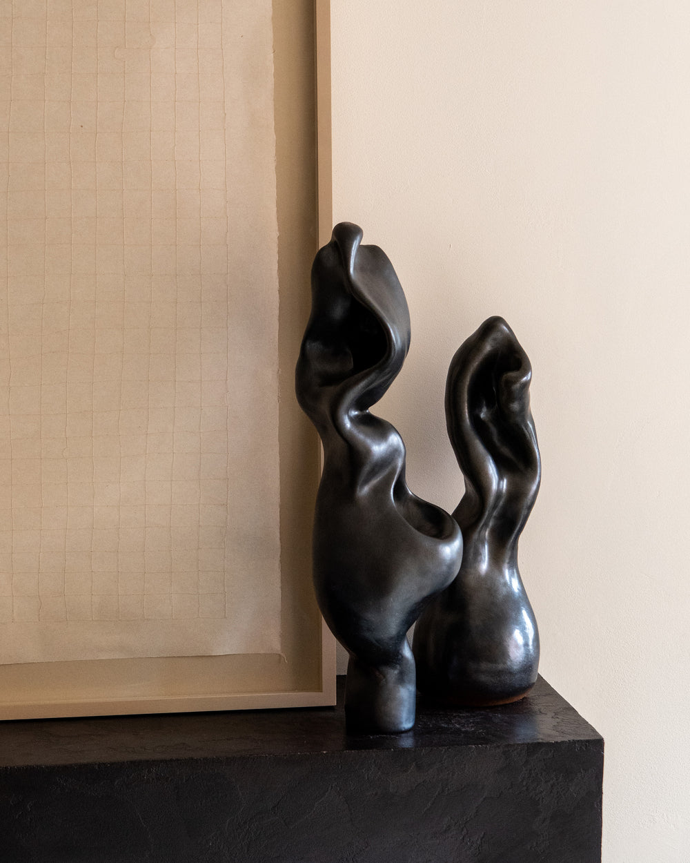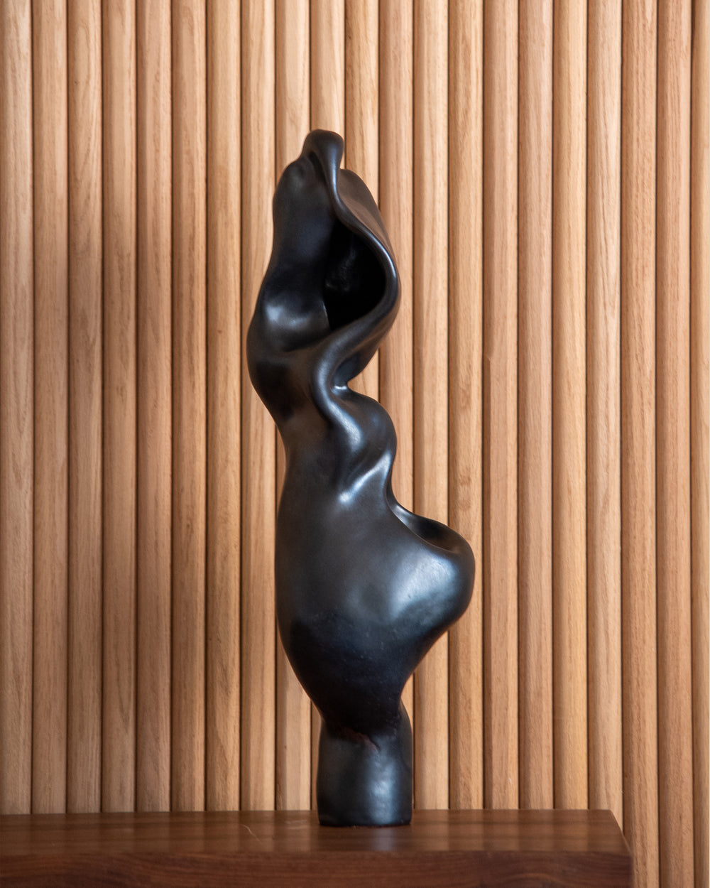 Finished with a spray-painted glaze technique, La Femme boasts a deep, rich hue that shifts from dark browns to rich ebony. This color and technique creates a striking contrast to its fluid form, anchoring it and enhancing its sculptural presence. The almost metallic appearance adds a layer of visual intrigue, making this sculpture a unique work of art, ready to add sophistication and artistry to your environment.