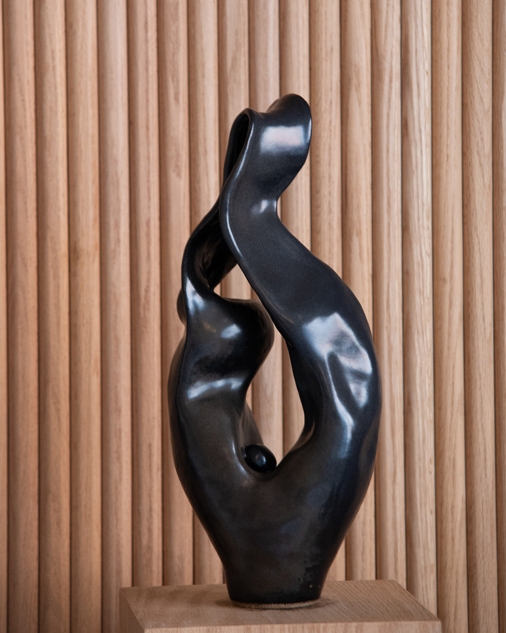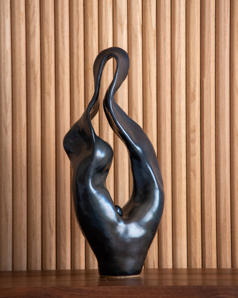 Inspired by the beauty of the female form and the magic of our inner world, this sculpture features a spray-painted glaze technique. Layers of deep, rich hues—from dark browns to rich ebony—create an almost metallic finish, offering a powerful visual contrast to its organic form.