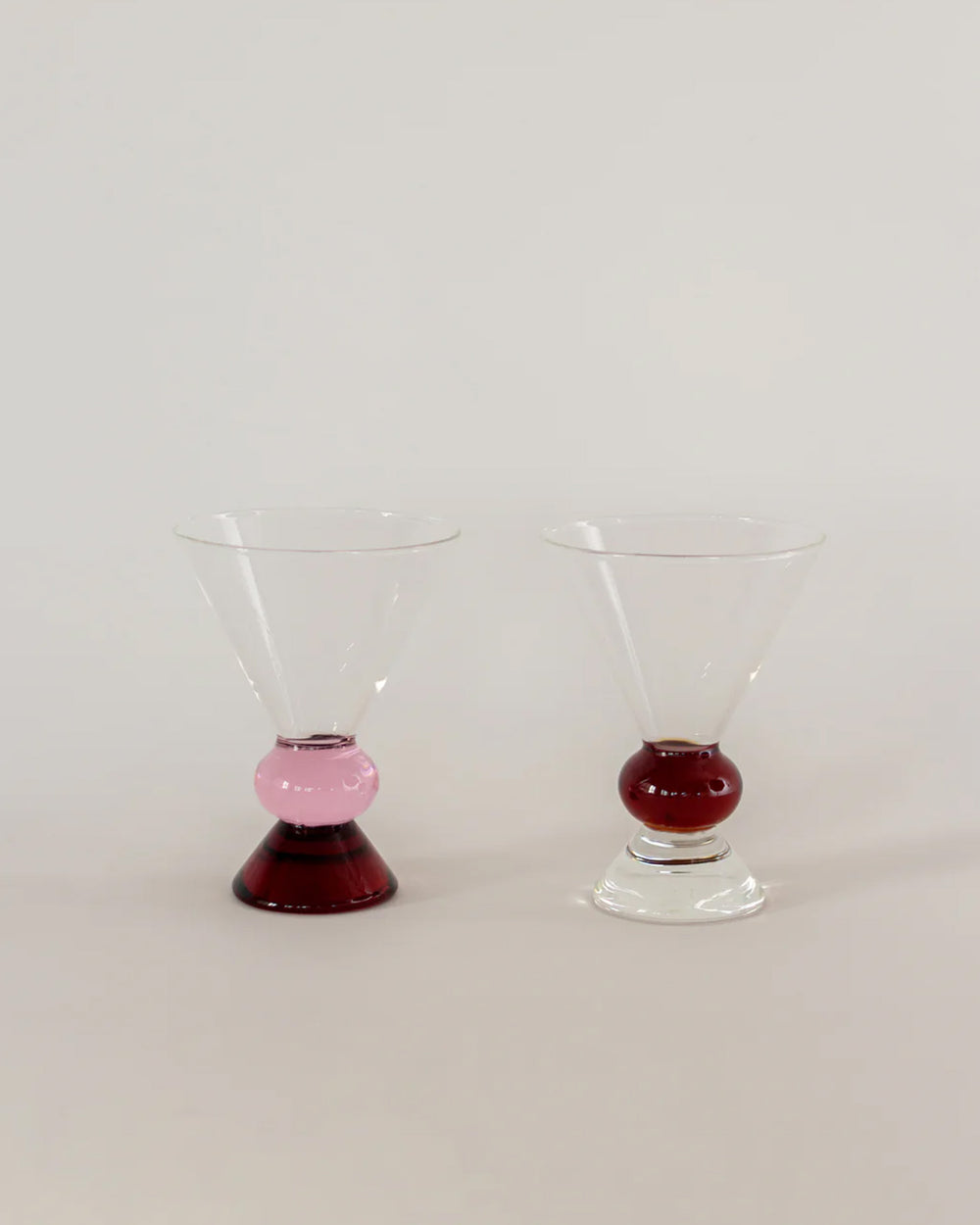 Inspired by the colorful totem poles of postmodern design, the solid base and proportions of these stemless cocktail glasses were designed with special consideration for longer drinks — spritzes, mixers, even sodas! — but still work beautifully with any classic cocktail.