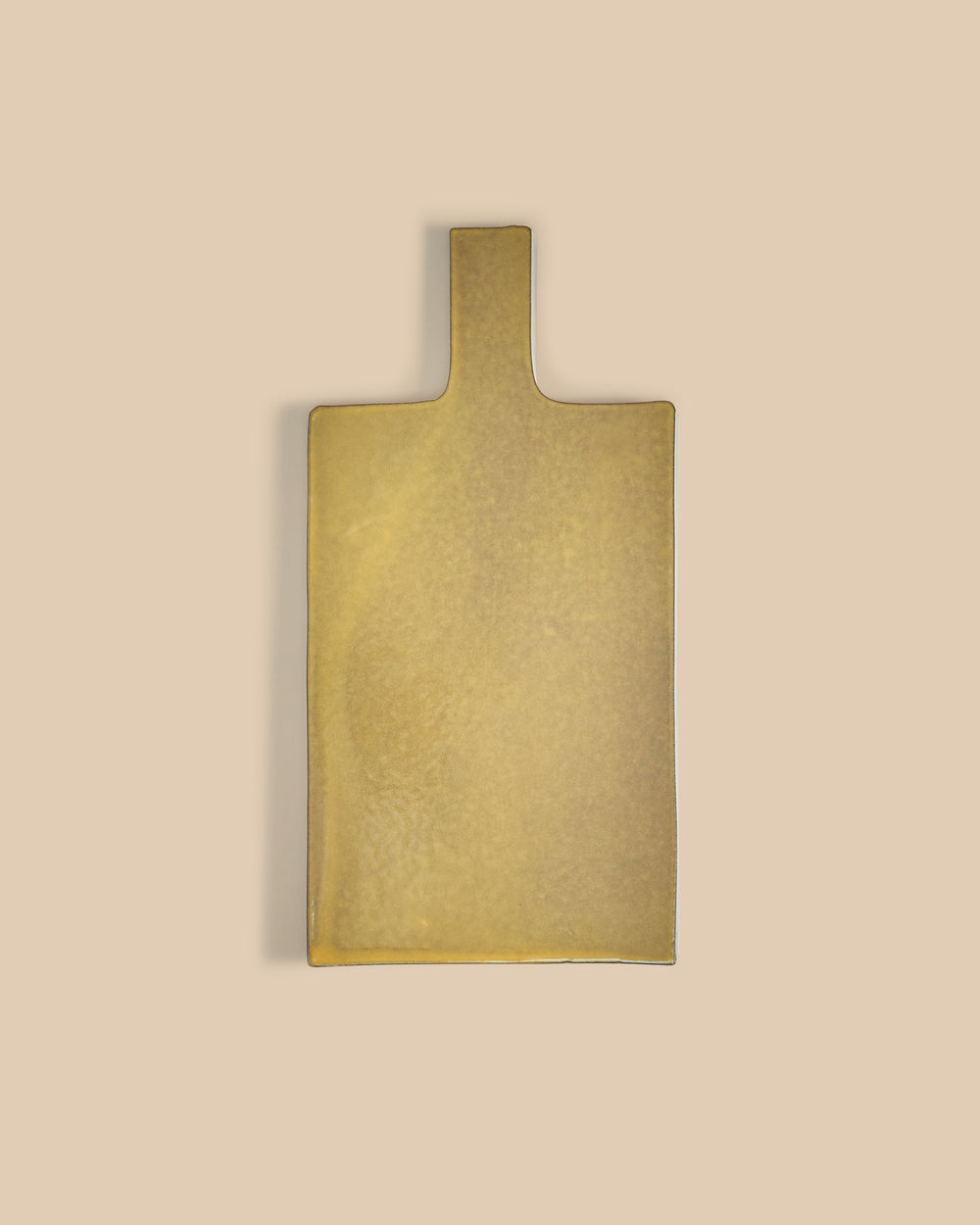 This elevated cheese board by Il Buco Vita is handcrafted of black clay with an Ocra glaze. Use this versatile piece as a unique ceramic charcuterie board. The Assisi line is handmade in Umbria, using traditional methods. Glazes are carefully applied with varying levels of transparency to feature the black terra cotta underneath making each piece unique.