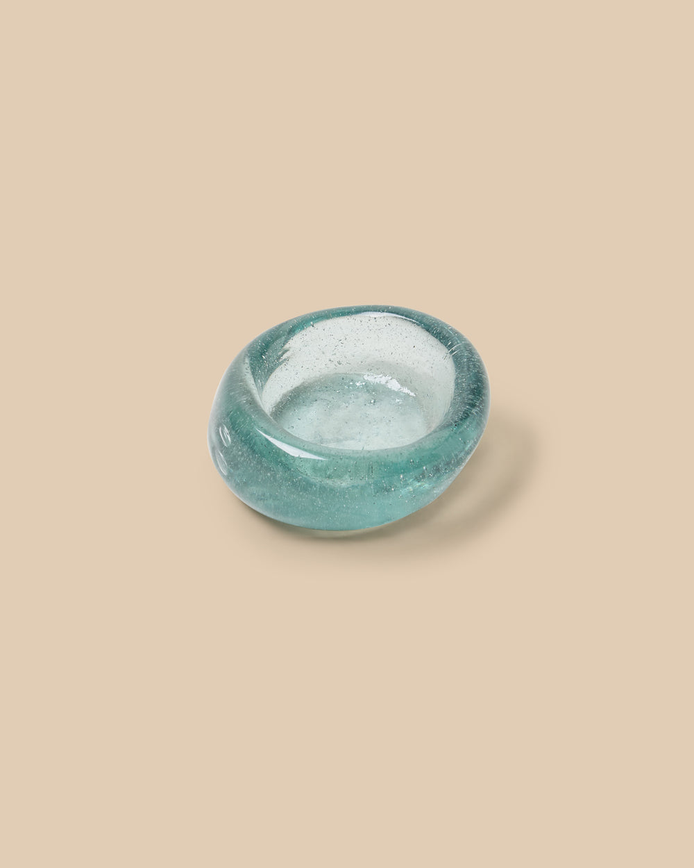 In the Maremma countryside in Tuscany, Italy; an eccentric artist transforms discarded glass objects into functional works of art. Her improvised, sculptural forms are blown freely, without the use of a mold, making every La Riccia creation unique. Each salt dish is made freeform, without molds, and each piece will vary slightly in size and shape. The blue-green glass tone reflects the selection of recyclables on hand when firing the kiln. This recycled glass salt jar is an elegant piece for daily use and will add charm to any kitchen countertop.