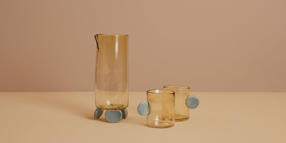 Sticky Glass is a New York based design company developed by Grace Whiteside that specializes in multi-functional, performative and collaborative glasswork. Each glassware piece is hand blown and made to order in Brooklyn, using a process that experiments with glass in its honey-like molten state, exploring the possibilities of form and function—allowing the final product to appear fluid, soft, and tacky.