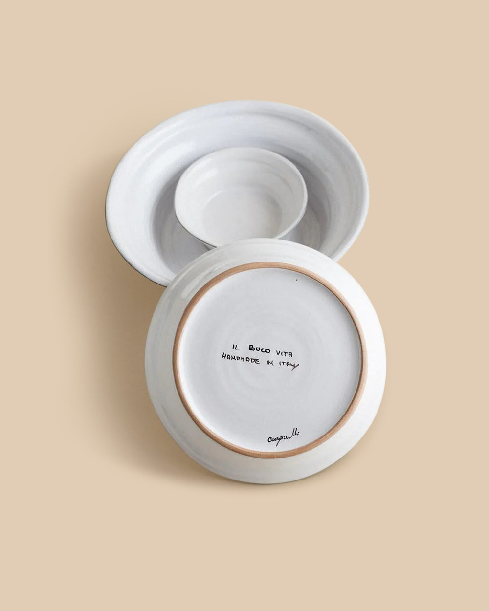 The Bevagna line by Il Buco Vita is produced in small batches in Perugia, Italy using the rich red earth of the region. Each piece is individually thrown on the wheel, hand-glazed in a lustrous white glaze, and double-baked. A green accent at the rim emphasizes elegant, handmade forms. Enjoy this small serving bowl as a decorative dish that adds versatility and artisanal elegance to entertaining.