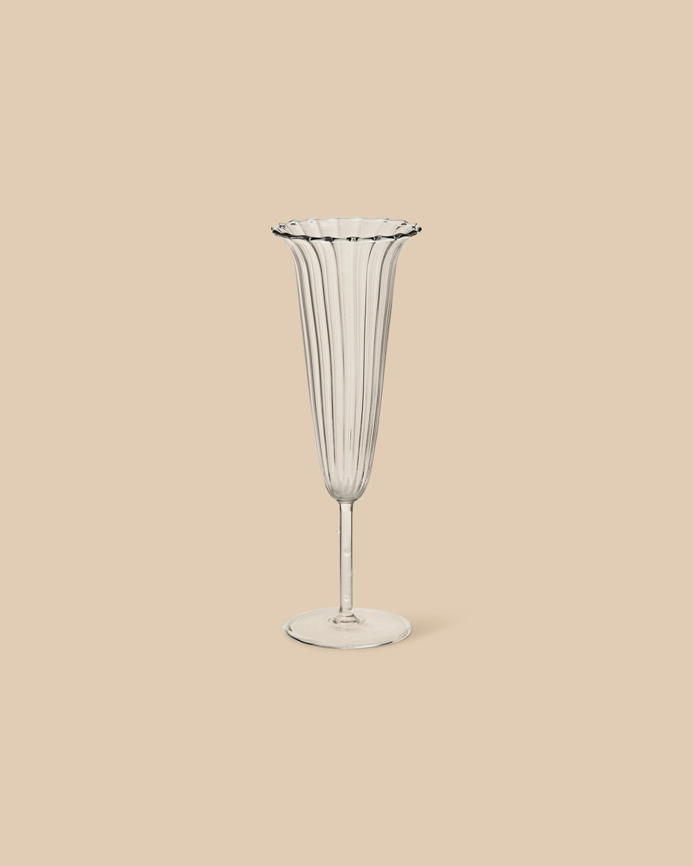 A part of the Bouquet Collection, the Angel Flute is crafted from borosilicate glass, offering a delicate yet durable construction. The sleek, flared shape and fluted design of the glass are inspired by the graceful petals of a flower, enhancing its elegance. Designed to hold sparkling beverages or light cocktails, its tall, refined form elevates the drinking experience while showcasing the beauty of hand-blown glass. Sold as a set of 4, these glasses effortlessly combine function and artistry, bringing a touch of floral-inspired elegance to any table setting.