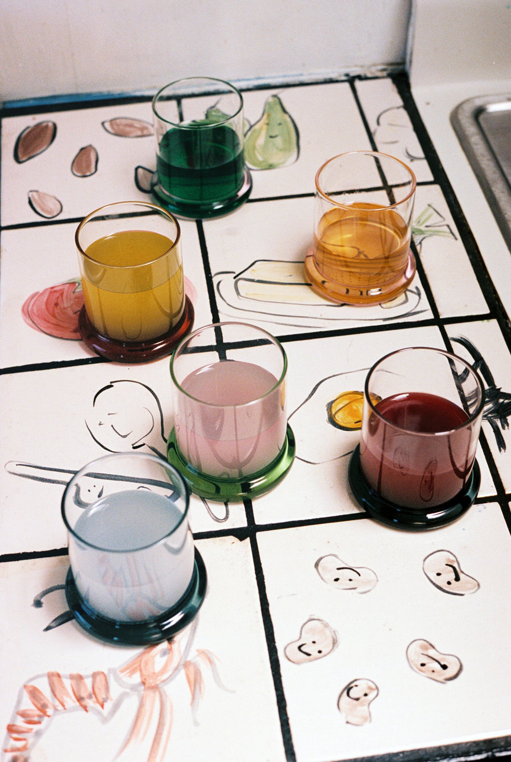 A set of two borosilicate glass tumblers, with matching colorful bases. Perfect for classic cocktails, your favorite aperitif or digestif (with rock or not), cordial or simply a splash of juice.