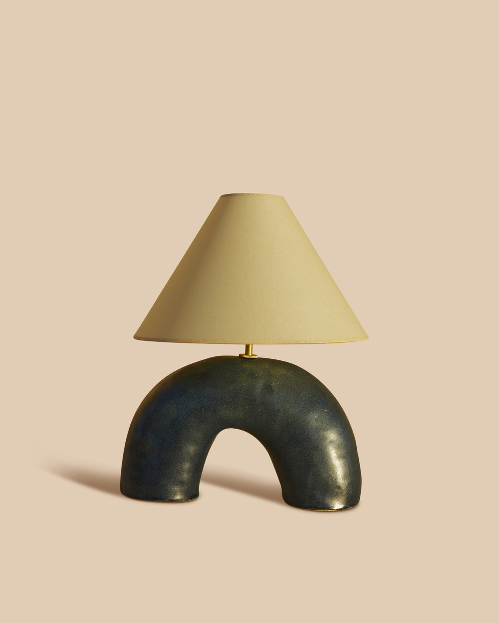 Material: Material: Stoneware and high temperature enamel and parchment shade. Brass seat and cap,