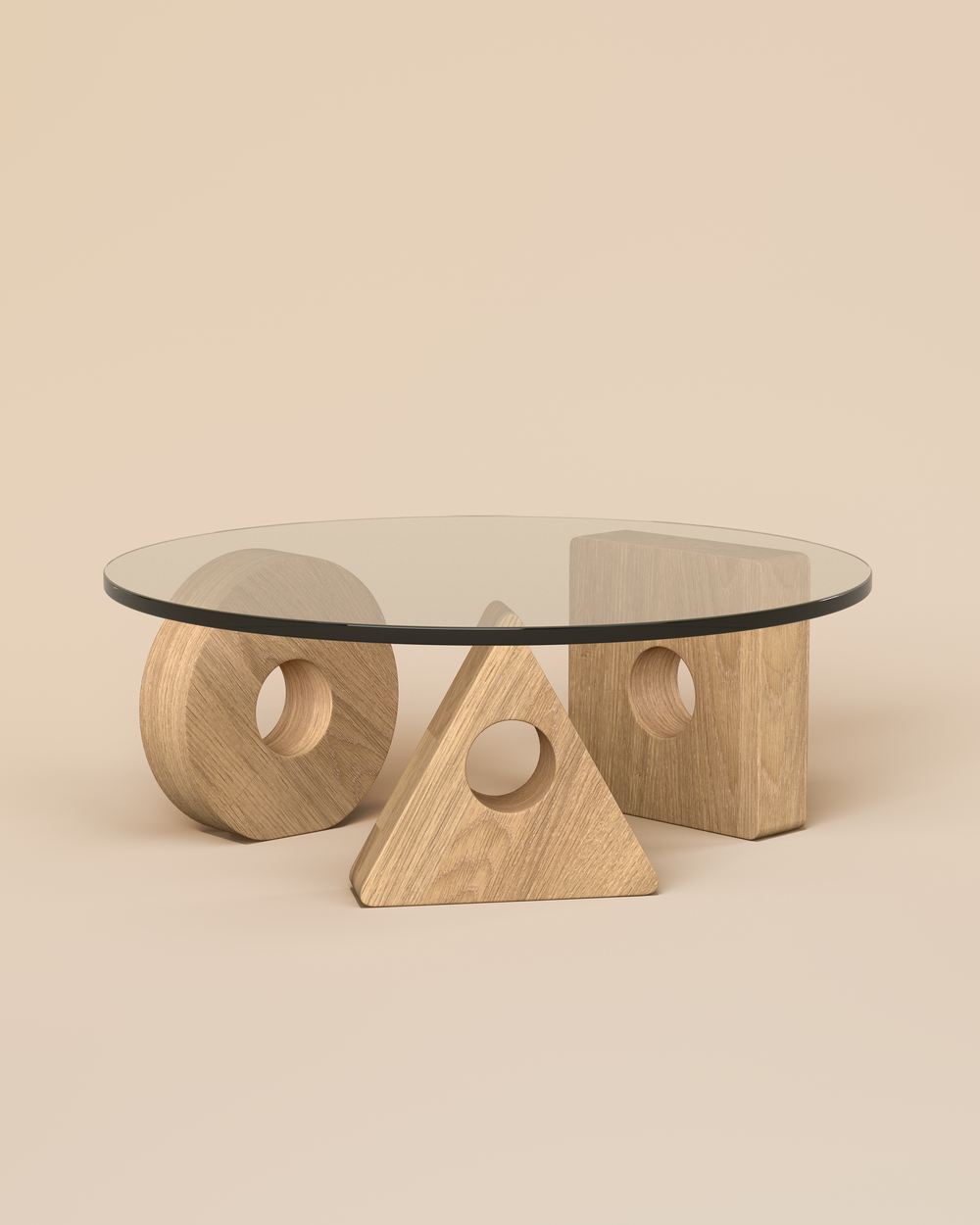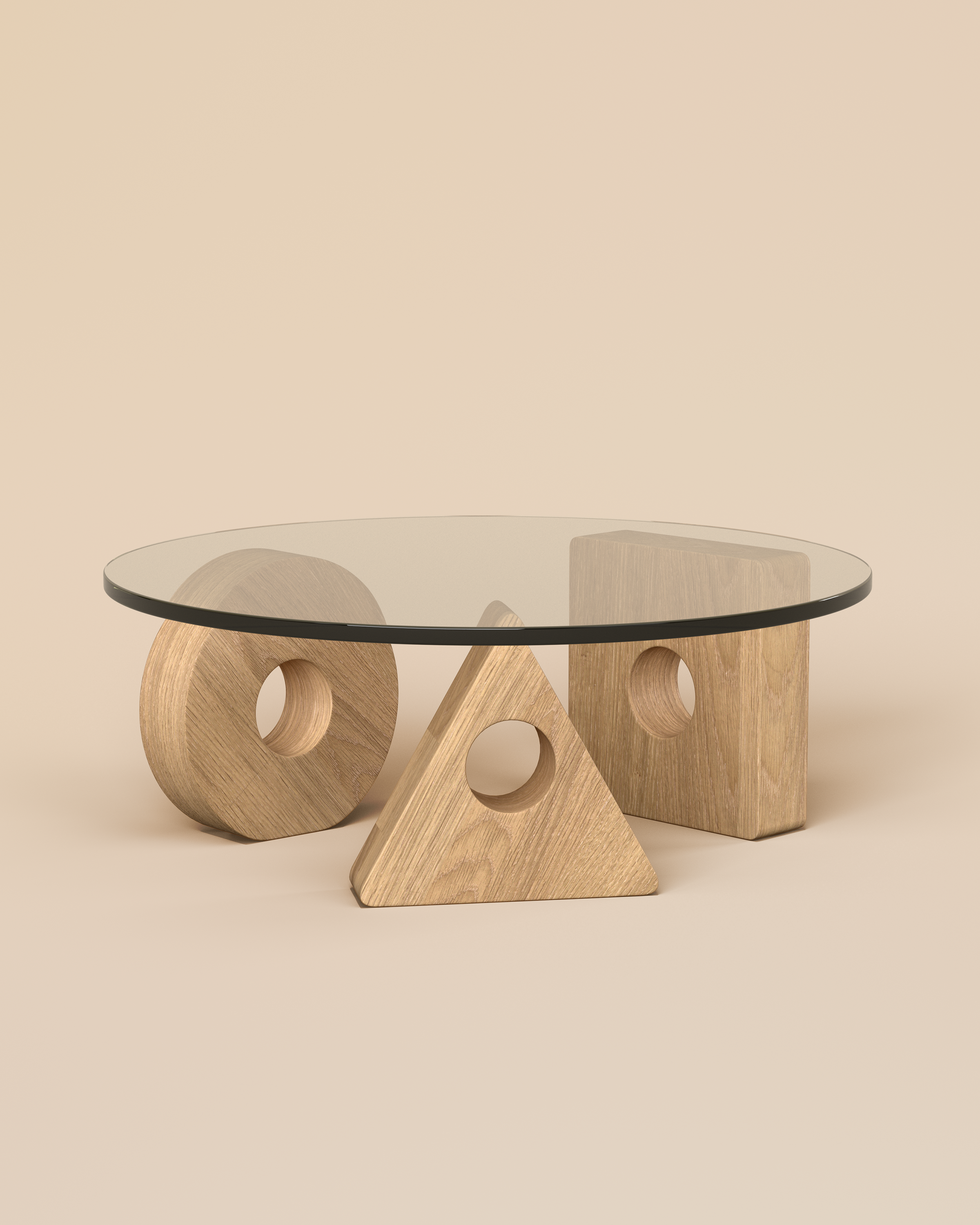 Meet Cosmo, the center of the ARJÉ furniture line. Revisiting the same symbolism as our walnut serving boards, this glass-top coffee table rests on three hand-cut, sculptural walnut silhouettes, crafted by hand in California from solid oak wood.