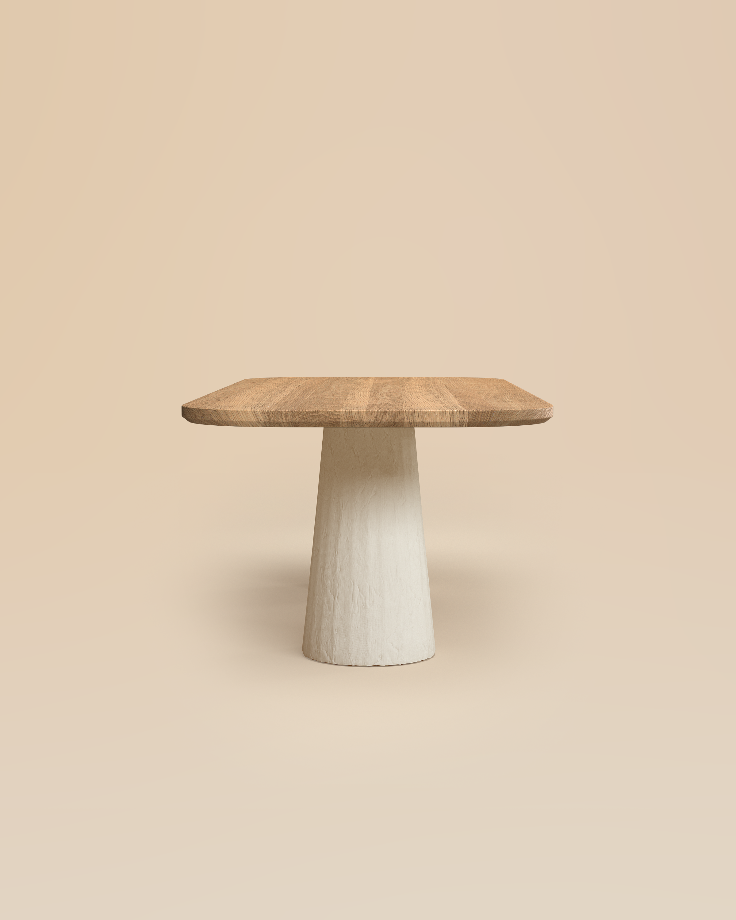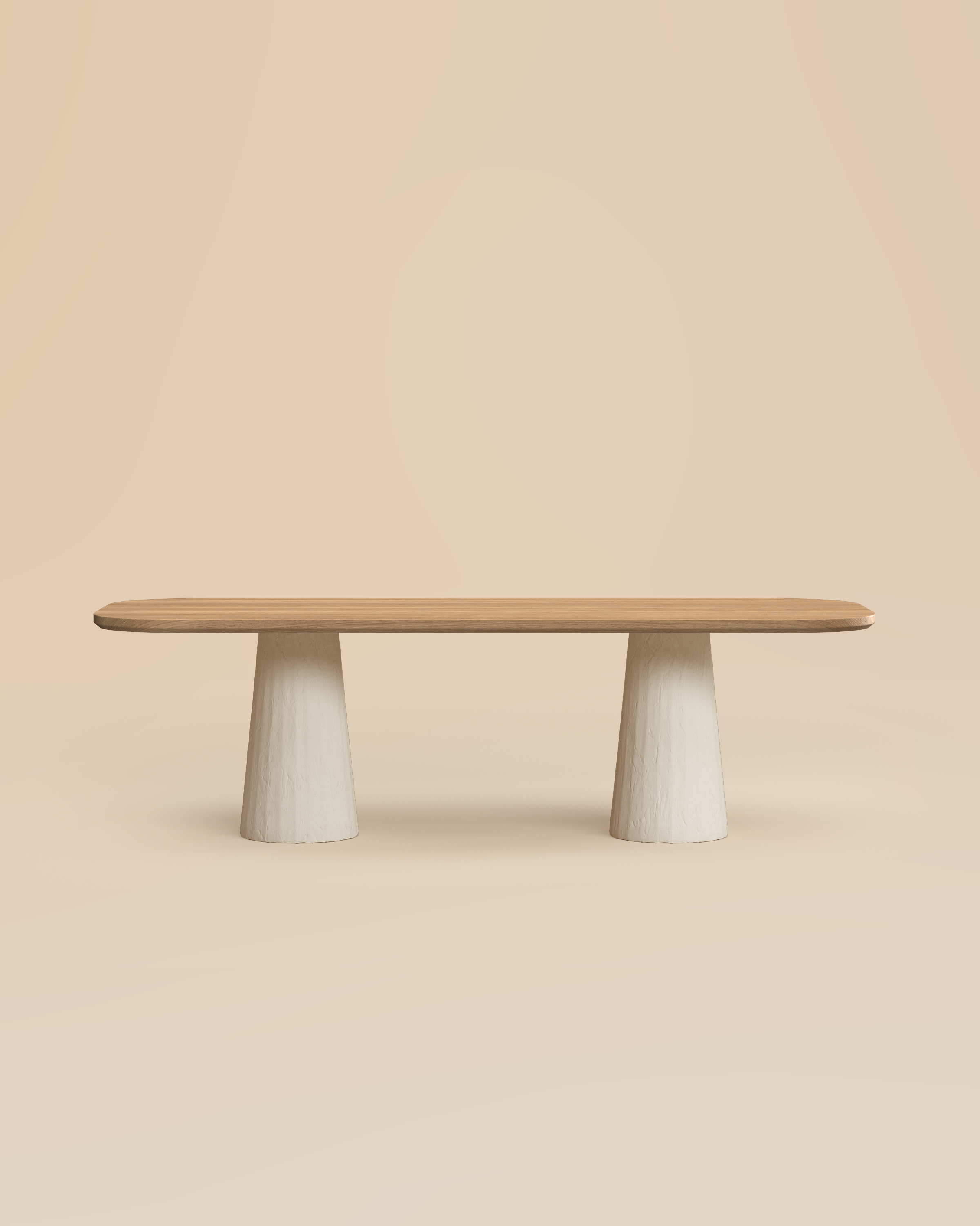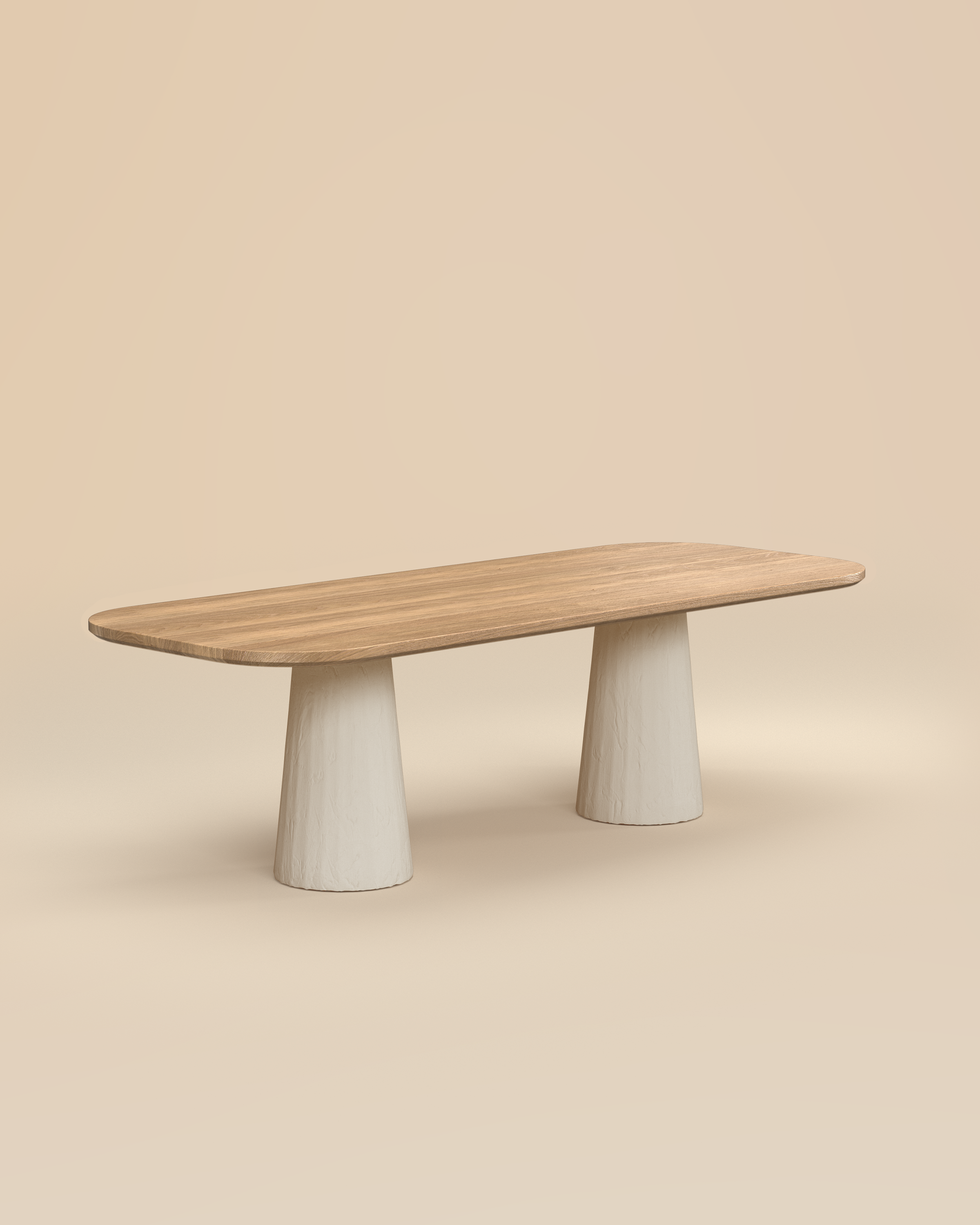 Our stylish oval-shaped dining table in solid oak wood sits atop contrasting cylindrical plaster legs. Eight feet long and crafted by hand in California. With contrasting plaster legs, Tessa seats eight people comfortably. Pairs beautifully with California-made Everything dining chairs in Oak.