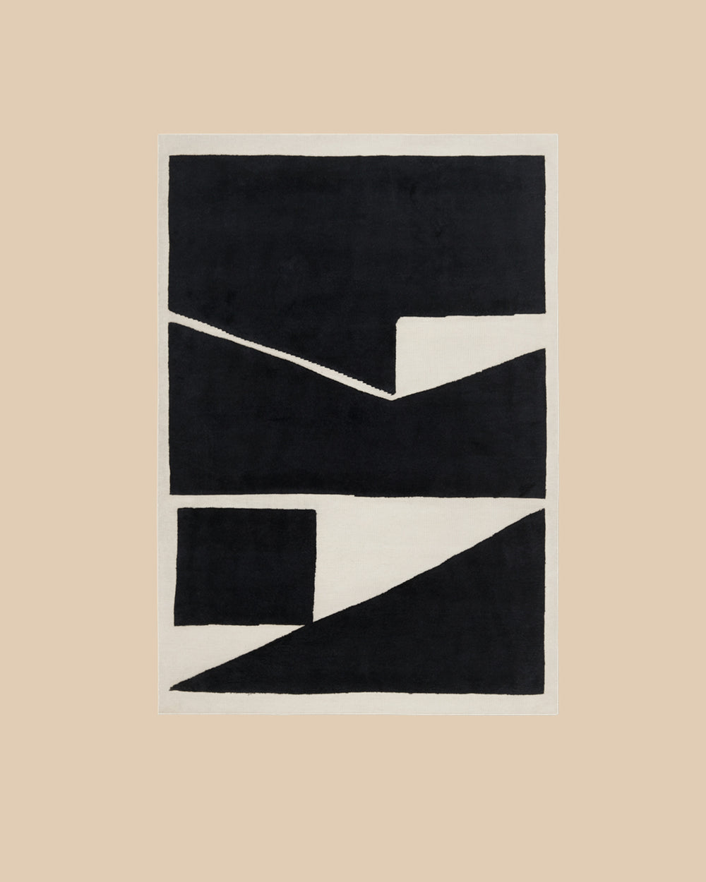 This graphic black and white rug in a geometric design was created by Danish contemporary artist Carsten Beck Nielson in Stockholm, and crafted by hand from soft New Zealand wool in India. No color has been used to create the pattern, instead contrast is achieved by combining a flat-woven canvas with a plush hand-knotted pile.