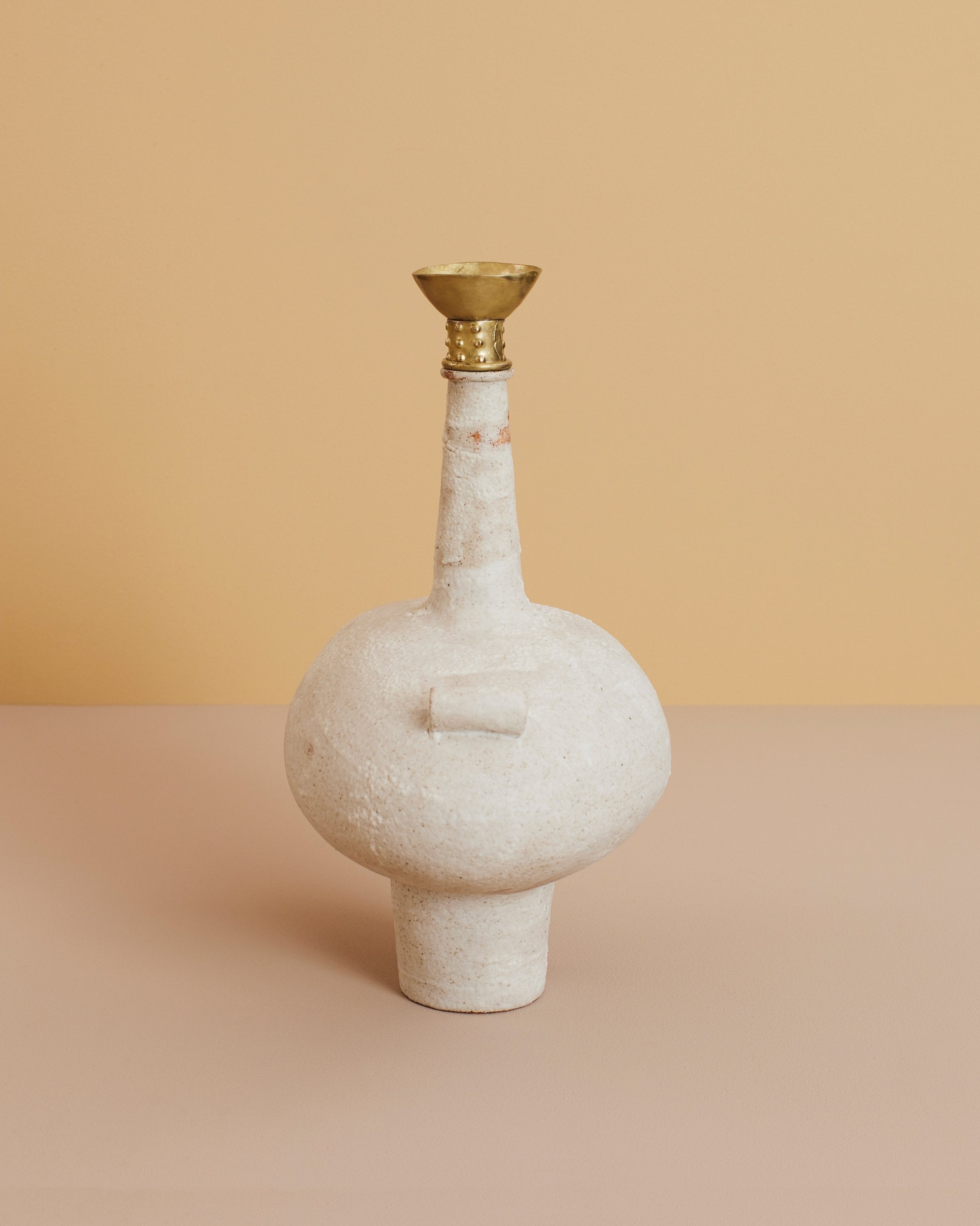 Isolated N. 13 glazed stone ceramic vase with intricate brass details belies its unique foundry and metal processes. This glazed stoneware vase features intricate brass details, a fusion made possible using unique foundry and metal processes for a piece that feels somehow ancient, timeless, and modern at once.