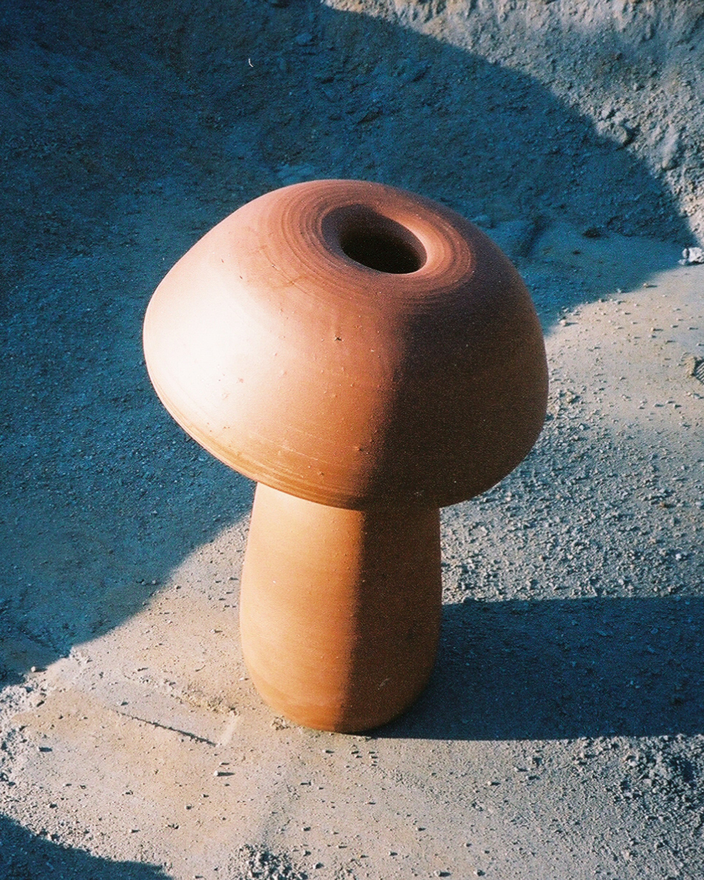 This mushroom-shaped bedside lamp is a hand-thrown ceramic lamp that is comprised of two pieces. The upper rests on the base with no hardware holding it in place allowing for movement of the light in any direction needed. The ball joint design allows the user to shift the shade as needed creating an experience that is both functional and intimate.