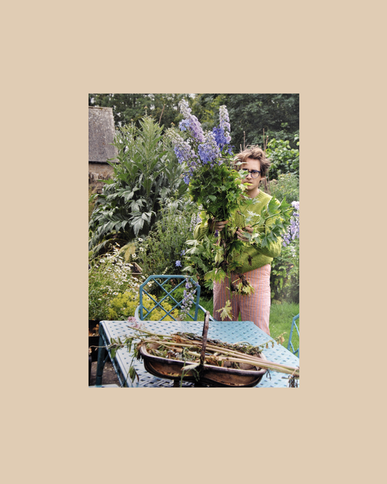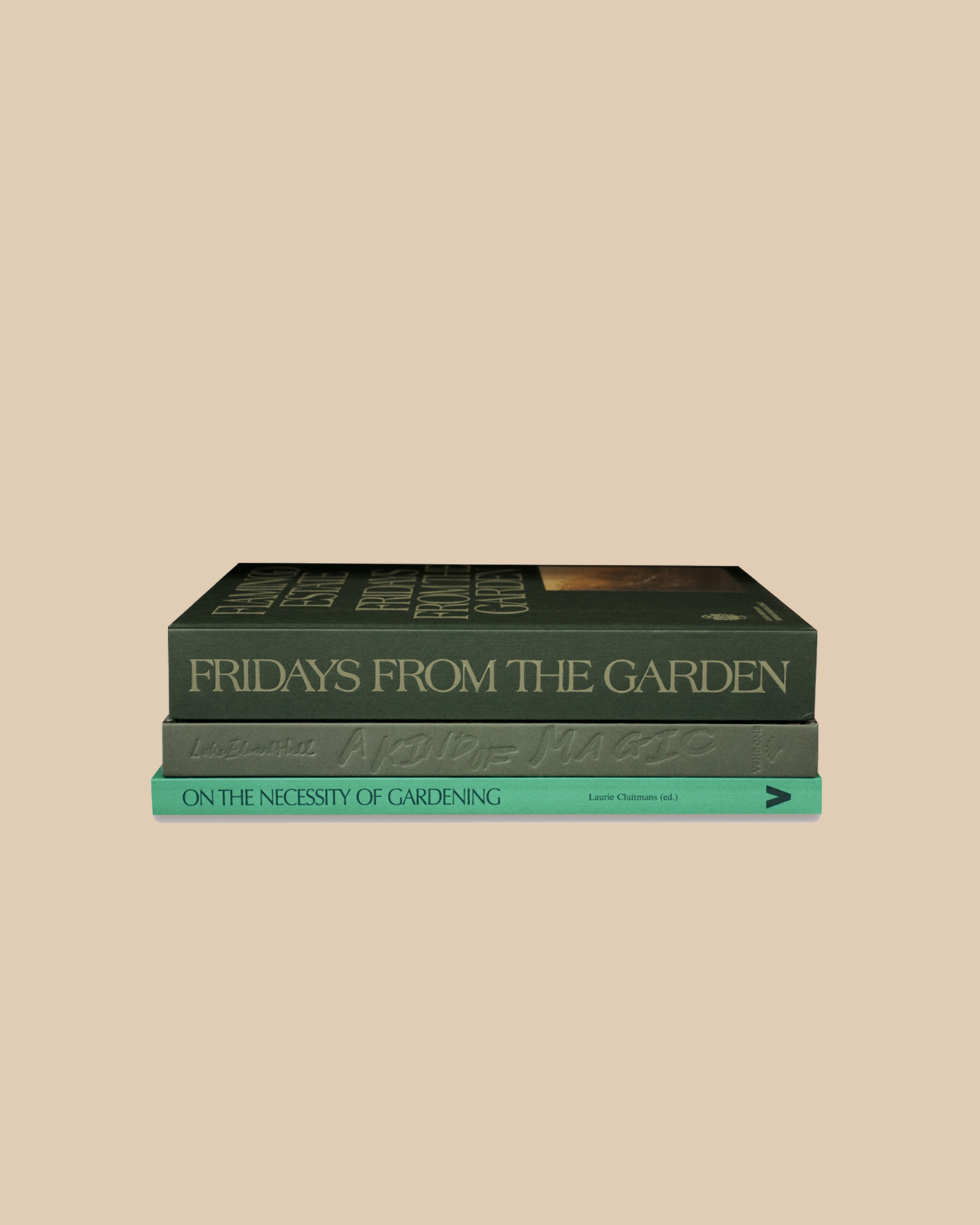 The Living in Season Book Stack includes: Flamingo Estate, Fridays from the Garden by Richard Christiansen, A Kind of Magic: The Kaleidoscopic World of Luke Edward Hall, On the Necessity of Gardening: An ABC of Art, Botany, and Cultivation by Laurie Cluitmans.