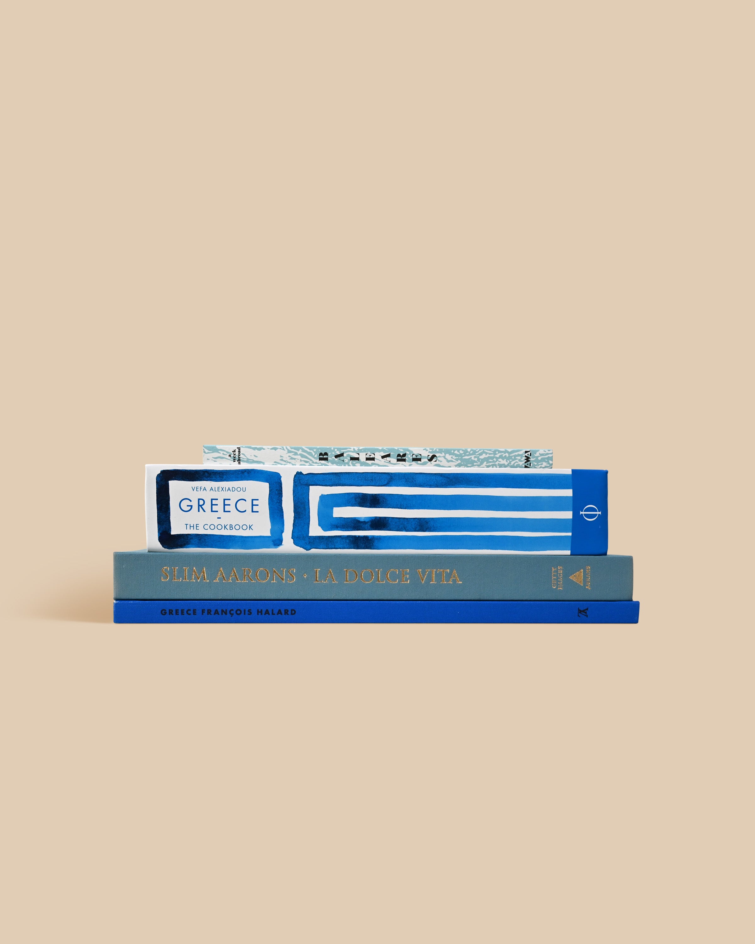 Curated to be as visually pleasing as it is to dive into, we call this one the Mediterranean Blue Book Stack: a collection of four rich blue hue-bound stories about travel, art, photography and food. Each stack is one-of-a-kind—this one includes Slim Aarons La Dolce Vita; Greece Francois Halard; Week Abroad Baleares and The Greece Cookbook.
