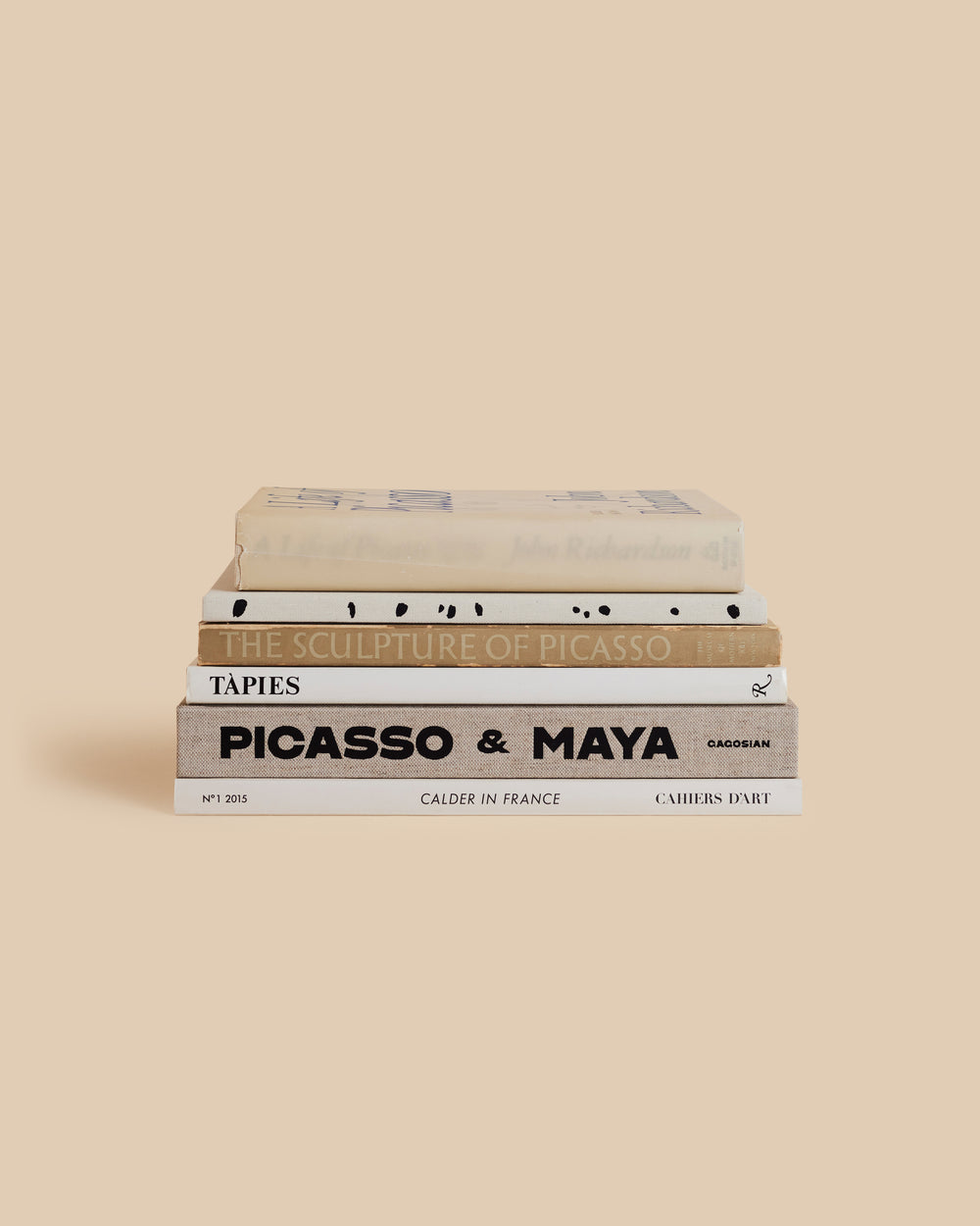 Each hand-selected mix of titles, including some rare and vintage, is sourced in collaboration with the Los Angeles-based Maison Plage. This neutral decorative books stack offers six titles honoring master artists in a rich array of beige, white, and black, creating an elegant neutral book display. Each is one-of-a-kind—includes: a rare vintage edition of A Life Of Picasso; Francois Halard's 56 Days In Arles; a rare vintage edition of The Sculpture of Picasso; a 1990 hardcover edition of TAPIES by Victoria C. Dexeus; Picasso & Maya Gagosian; and Calder in France.