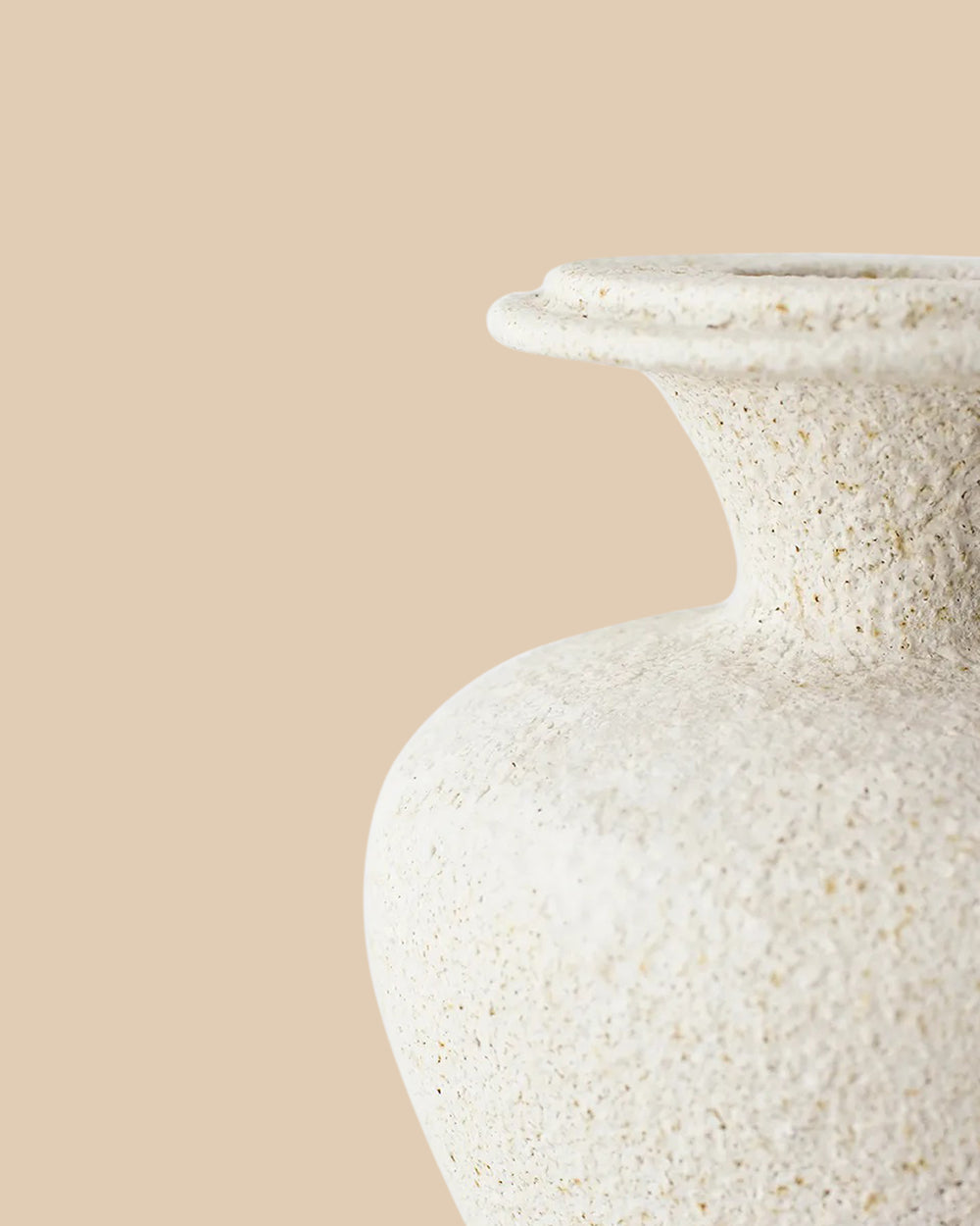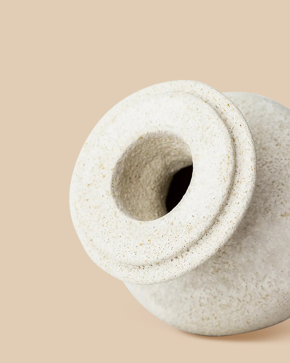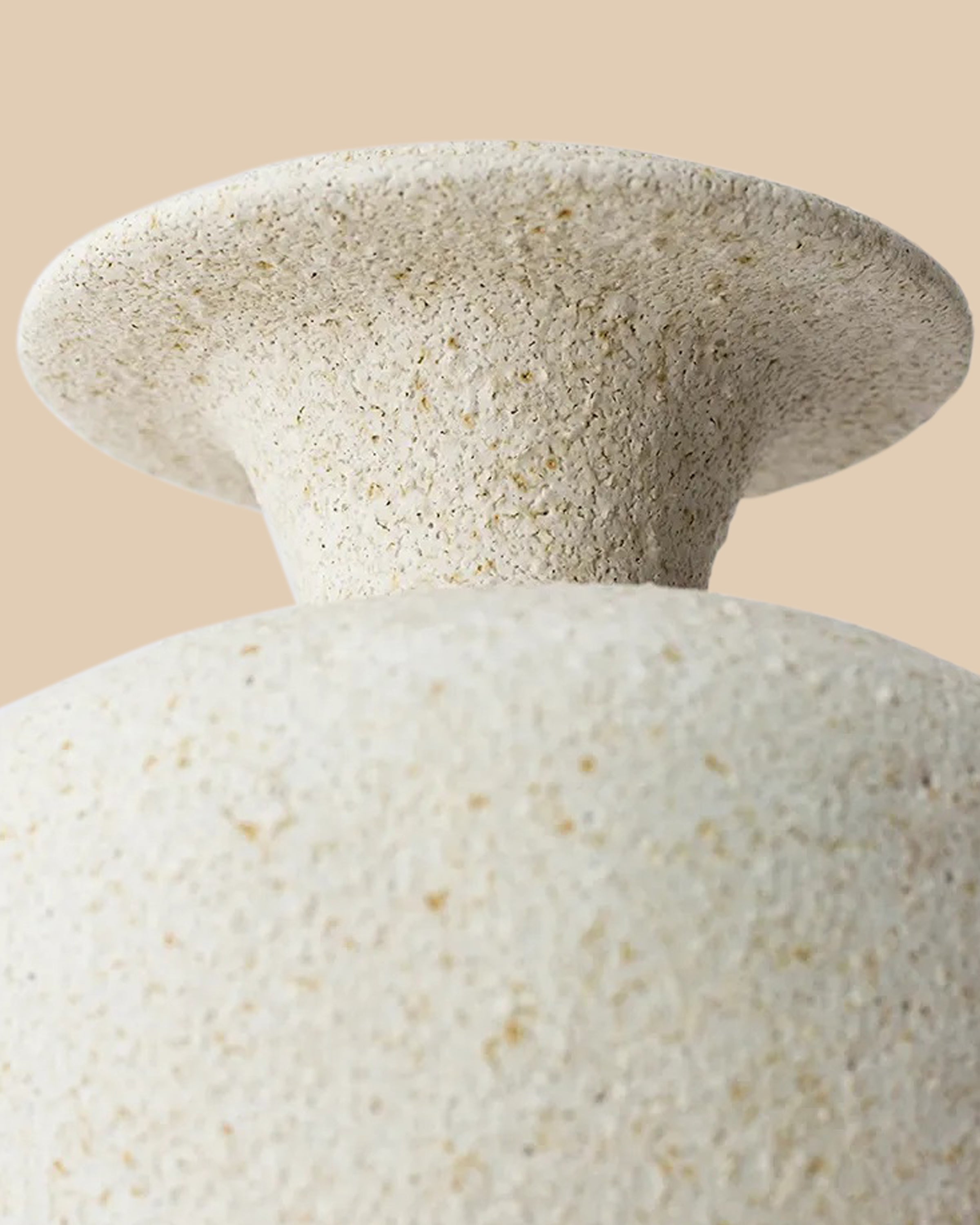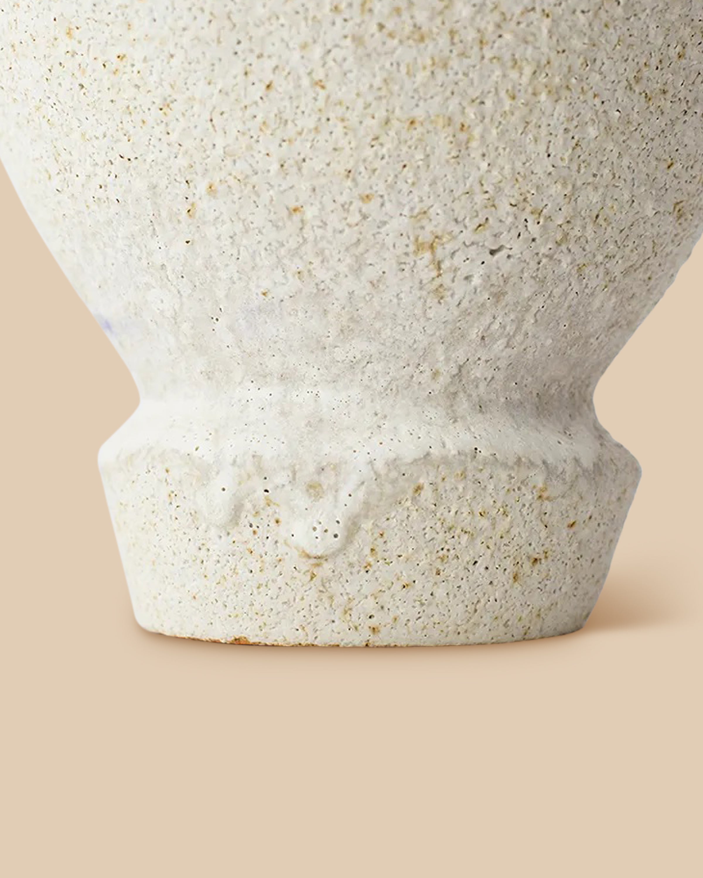 Hydria evokes an ancient Mediterranean urn in a modern natural stone vase. This glazed handbuilt vessel is made from stoneware with grog from Manises, Spain, and brushed with experimental glazes and a textured surface, resulting in slight variations with each piece. Each piece feels somehow ancient, timeless, and modern at once.