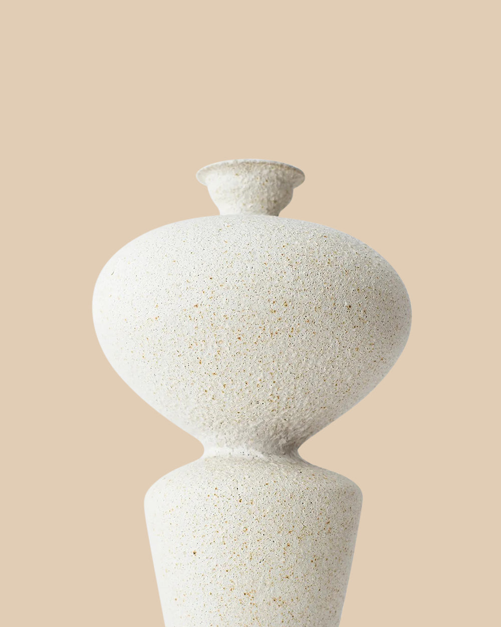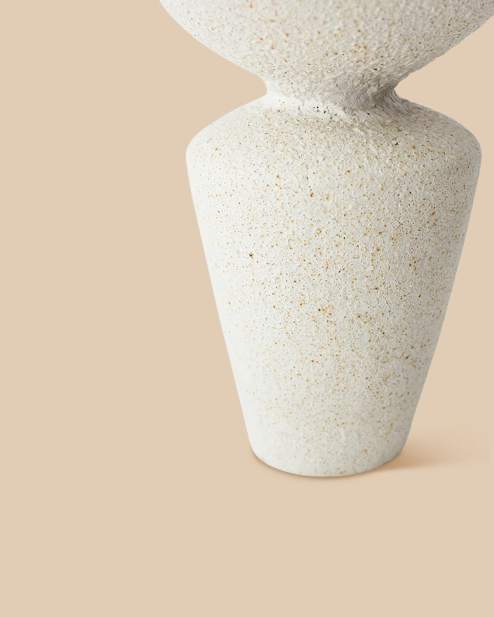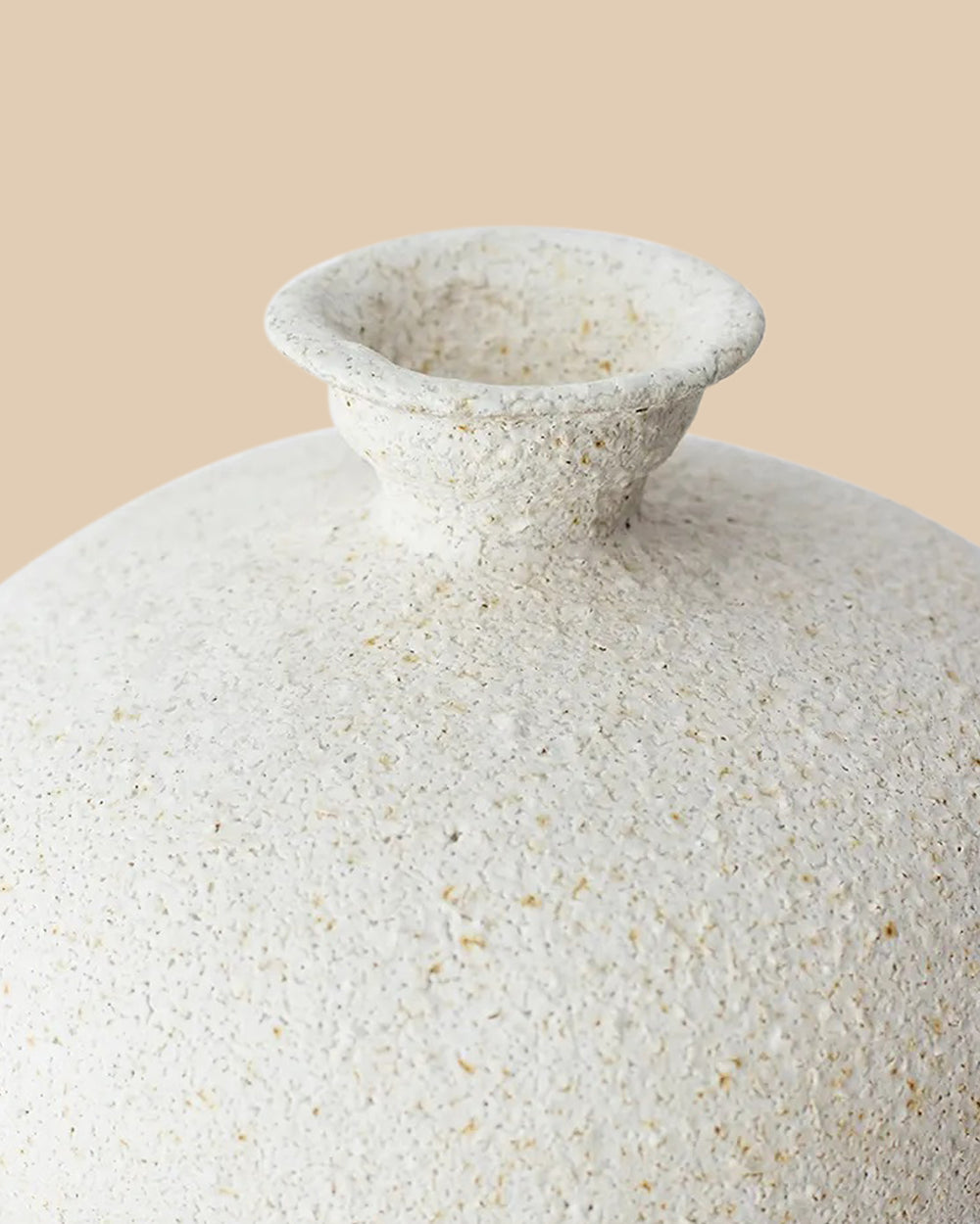 Lebes is a handmade artisan textured sculptural vase perfect for Mediterranean-inspired floral arrangements. This glazed handbuilt vessel is made from stoneware with grog from Manises, Spain, and brushed with experimental glazes and a textured surface, resulting in slight variations with each piece. Each piece feels somehow ancient, timeless, and modern at once.
