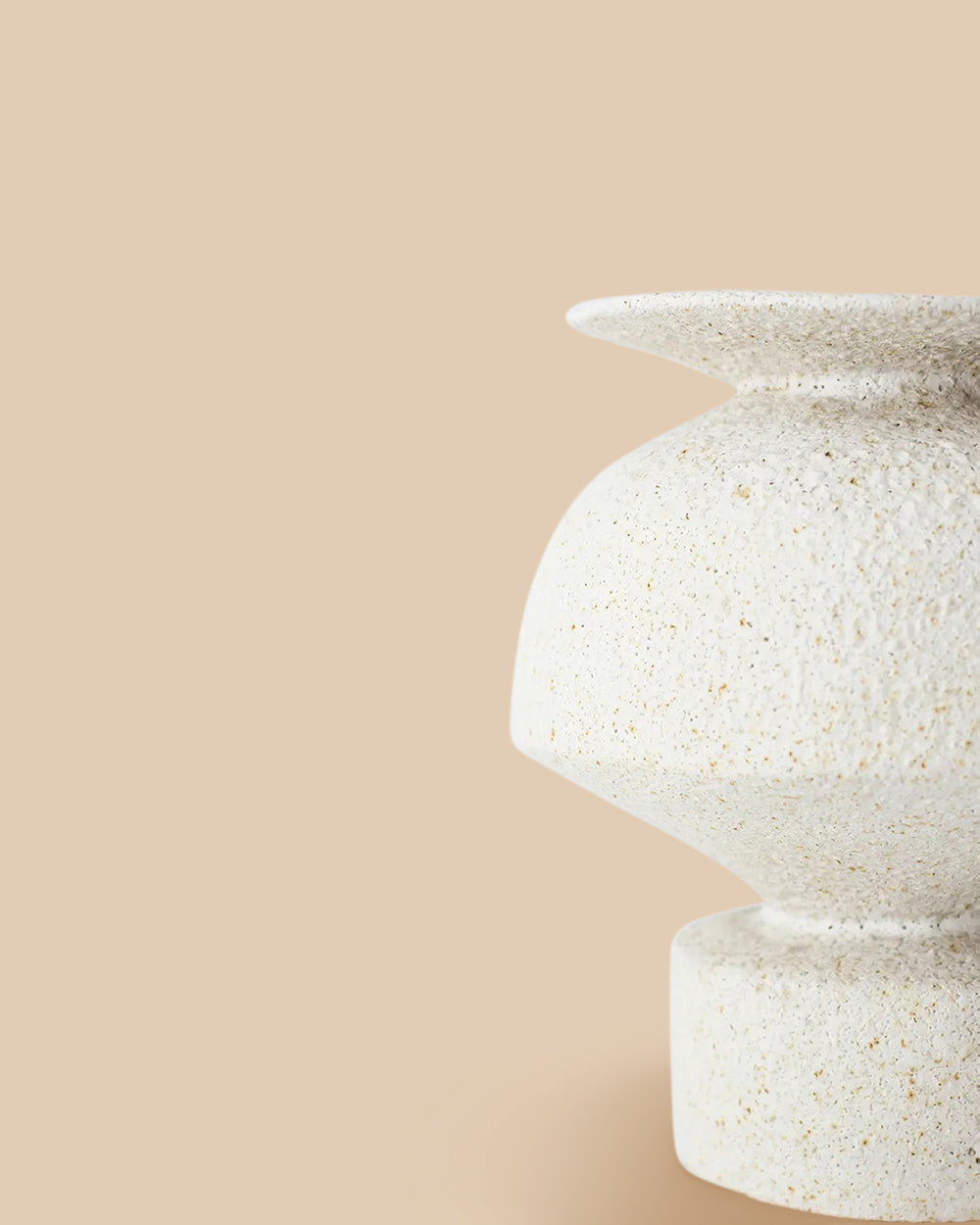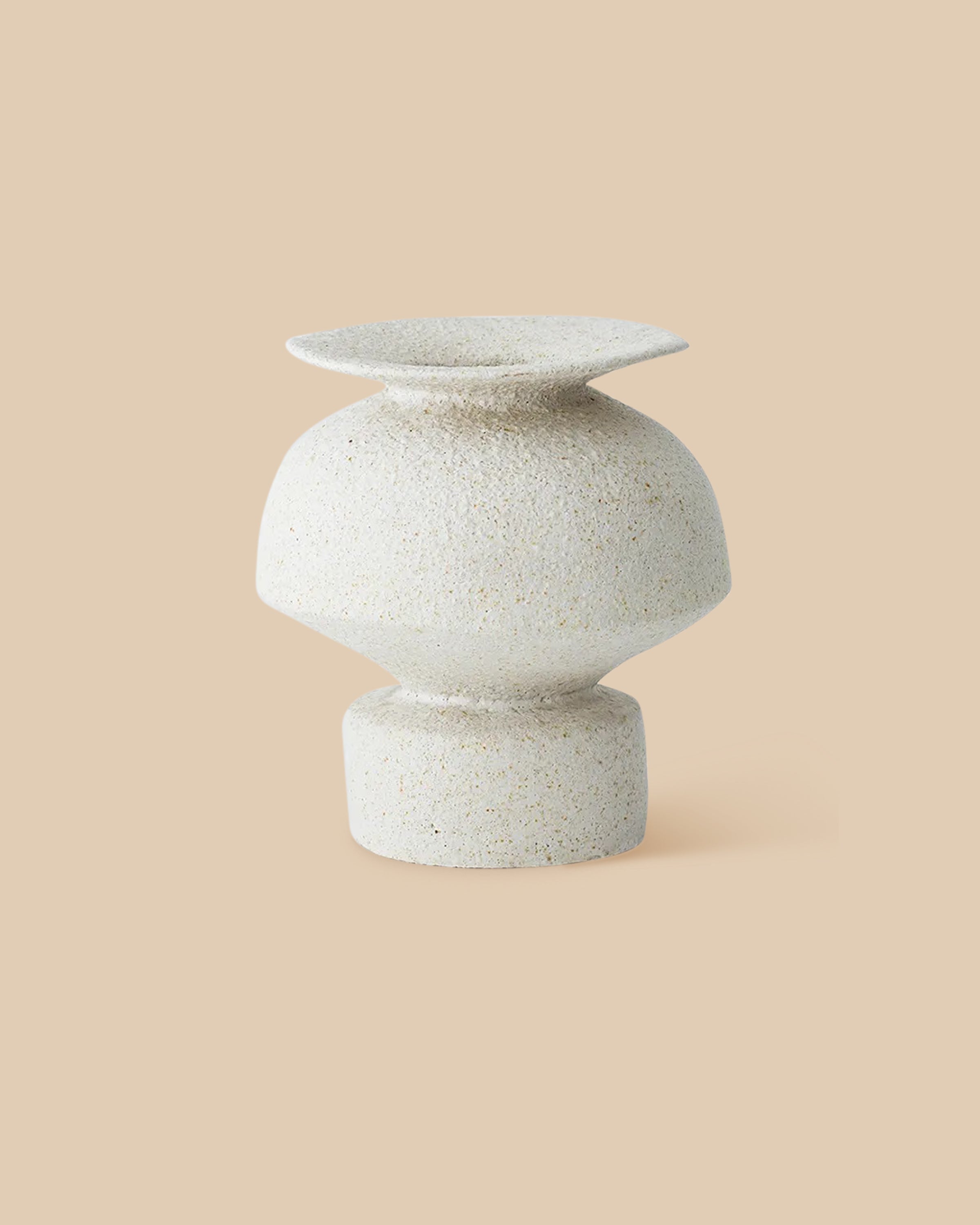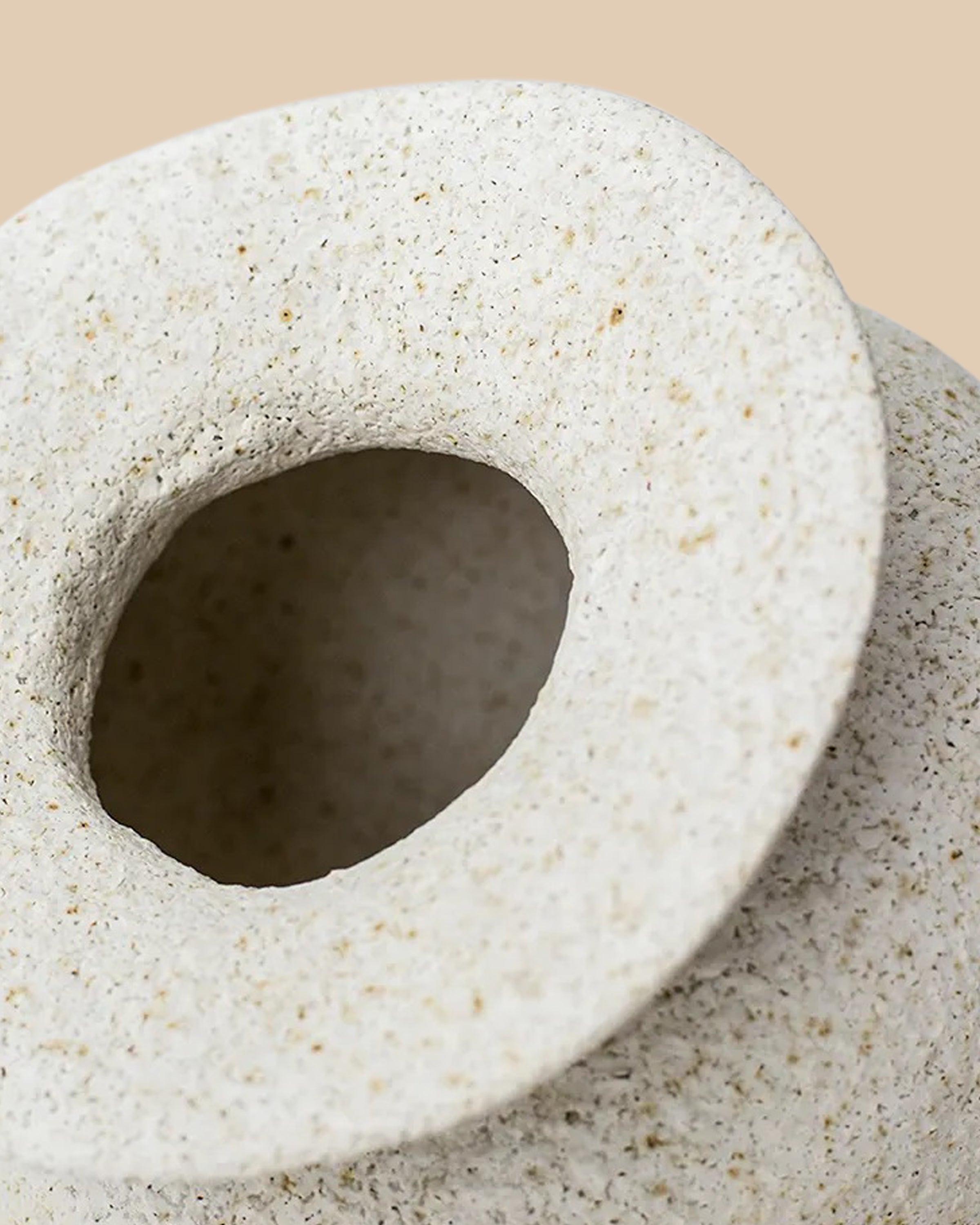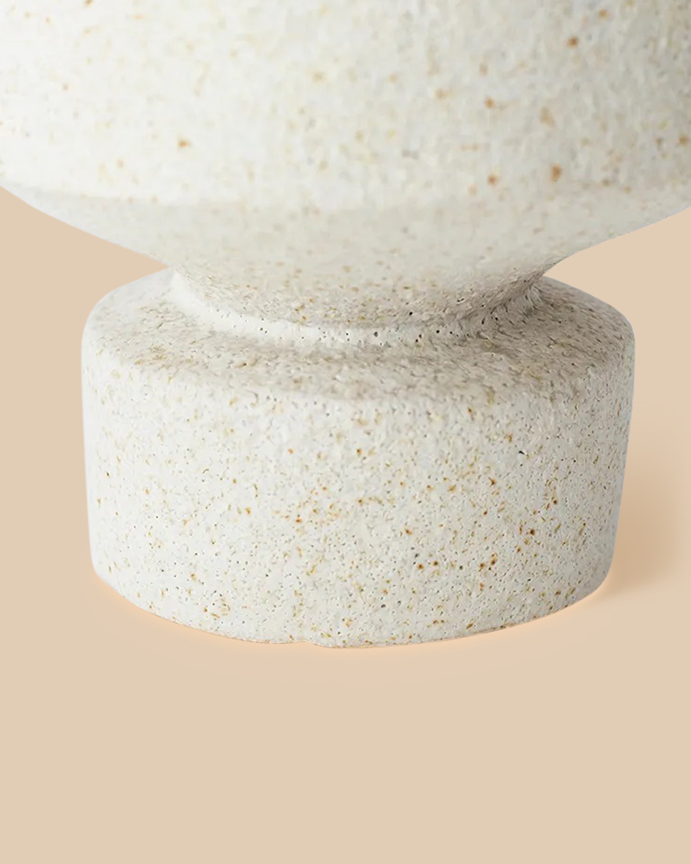 Pycster is a handcrafted ceramic vessel with a natural white stone finish inspired by classic Greek pottery design. This glazed handbuilt vessel is made from stoneware with grog from Manises, Spain, and brushed with experimental glazes and a textured surface, resulting in slight variations with each piece. Each piece feels somehow ancient, timeless, and modern at once.