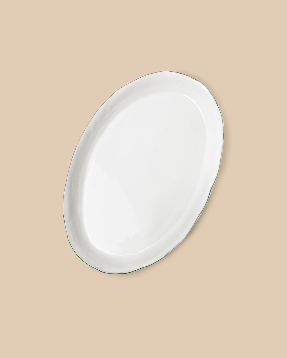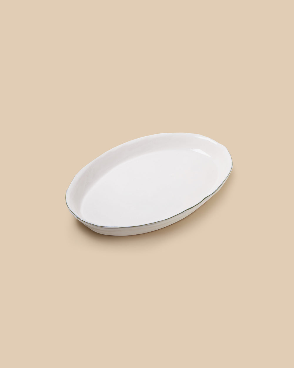 The Bevagna line by Il Buco Vita by Il Buco Vita is produced in small batches in Perugia, Italy using the rich red earth of the region. Each piece is individually thrown on the wheel, hand glazed in a lustrous white glaze, and double baked. A green accent at the rim emphasizes elegant, handmade forms. This deep ceramic serving platter is the perfect deep-dish serving plate for generous portions.