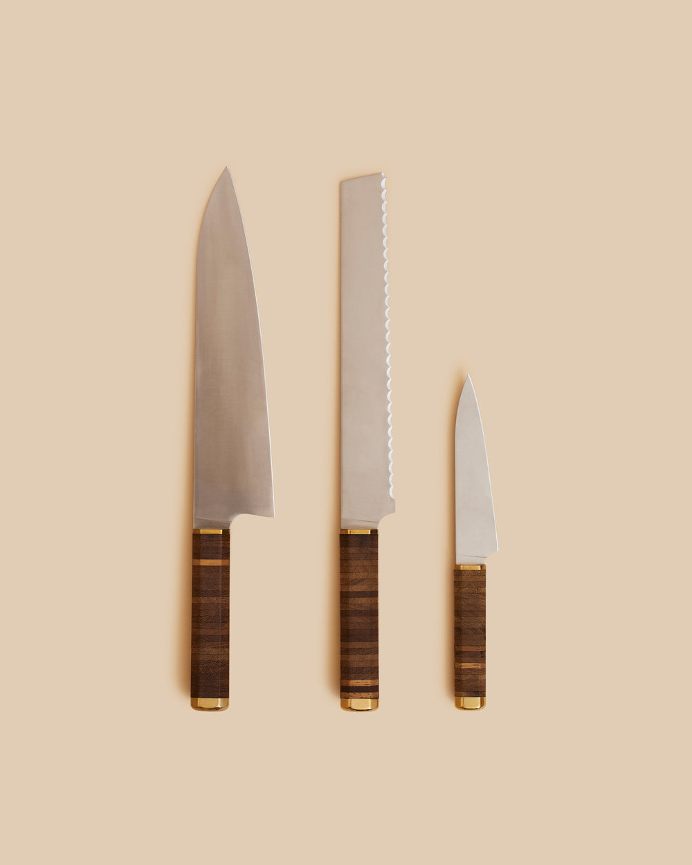 With stacked hardwood handles and high carbon stainless steel blades, this trio is based on traditional Japanese designs. It includes a paring knife with a more prominent heel compared to western paring knives; a large all-purpose kitchen knife with a thinner, lighter and harder blade; and a 240mm long, 8mm serrated bread knife.