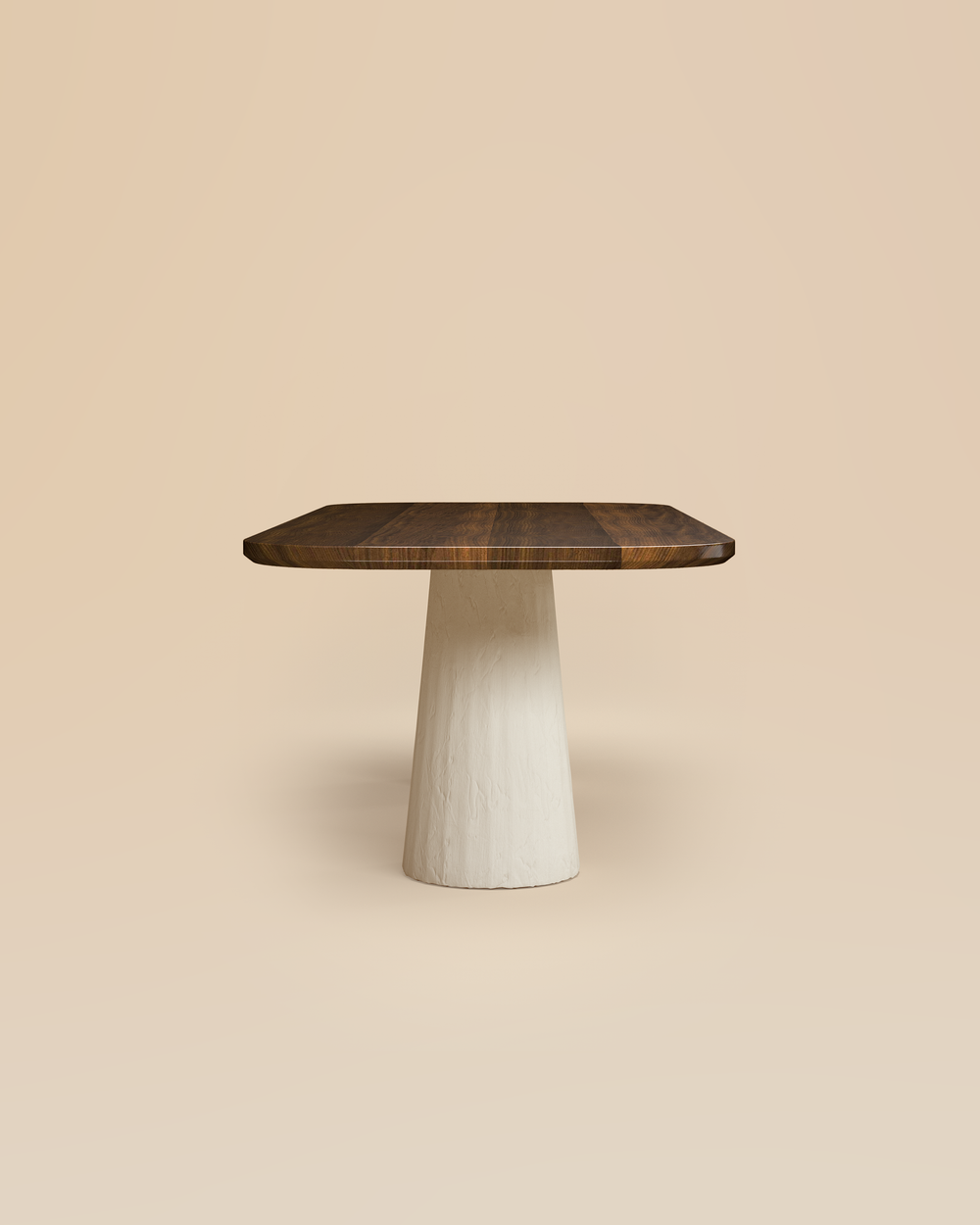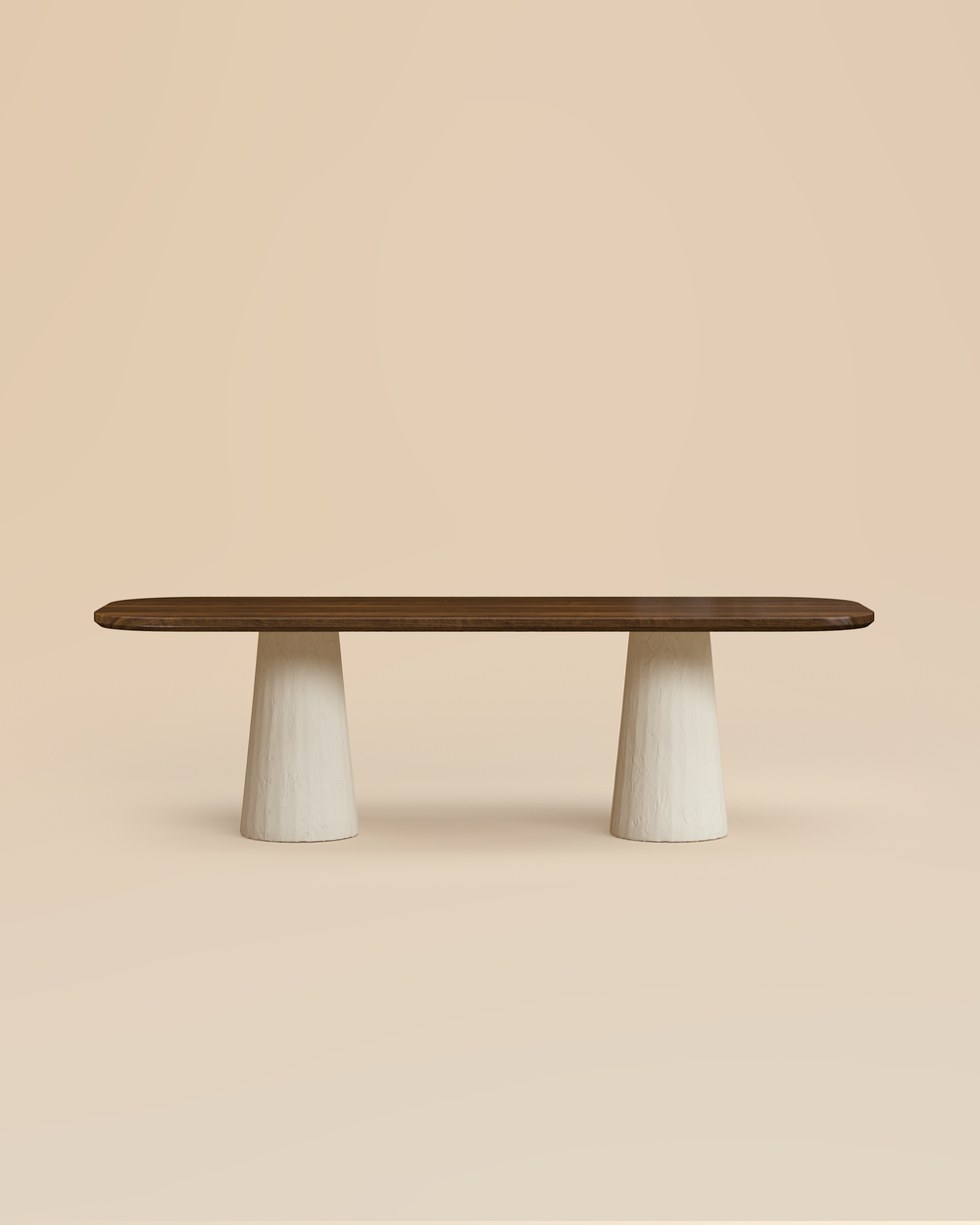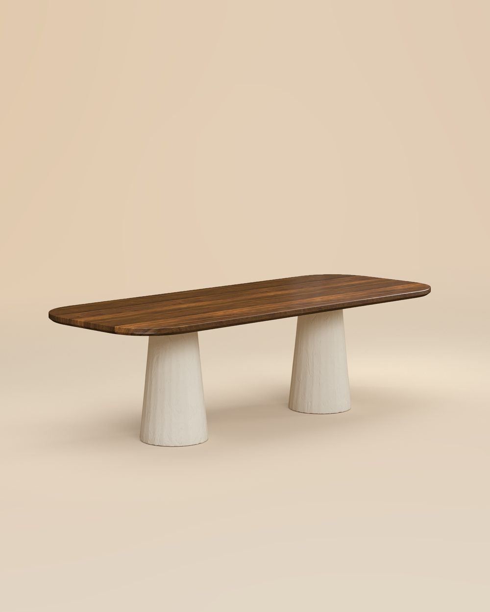 Our stylish oval-shaped dining table in solid walnut wood sits atop contrasting cylindrical plaster legs. Eight feet long and crafted by hand in Brooklyn, NY from black walnut harvested along the North East in USA. With contrasting plaster legs, Tessa seats eight people comfortably. Pairs beautifully with Brooklyn-made Gradual dining chairs.