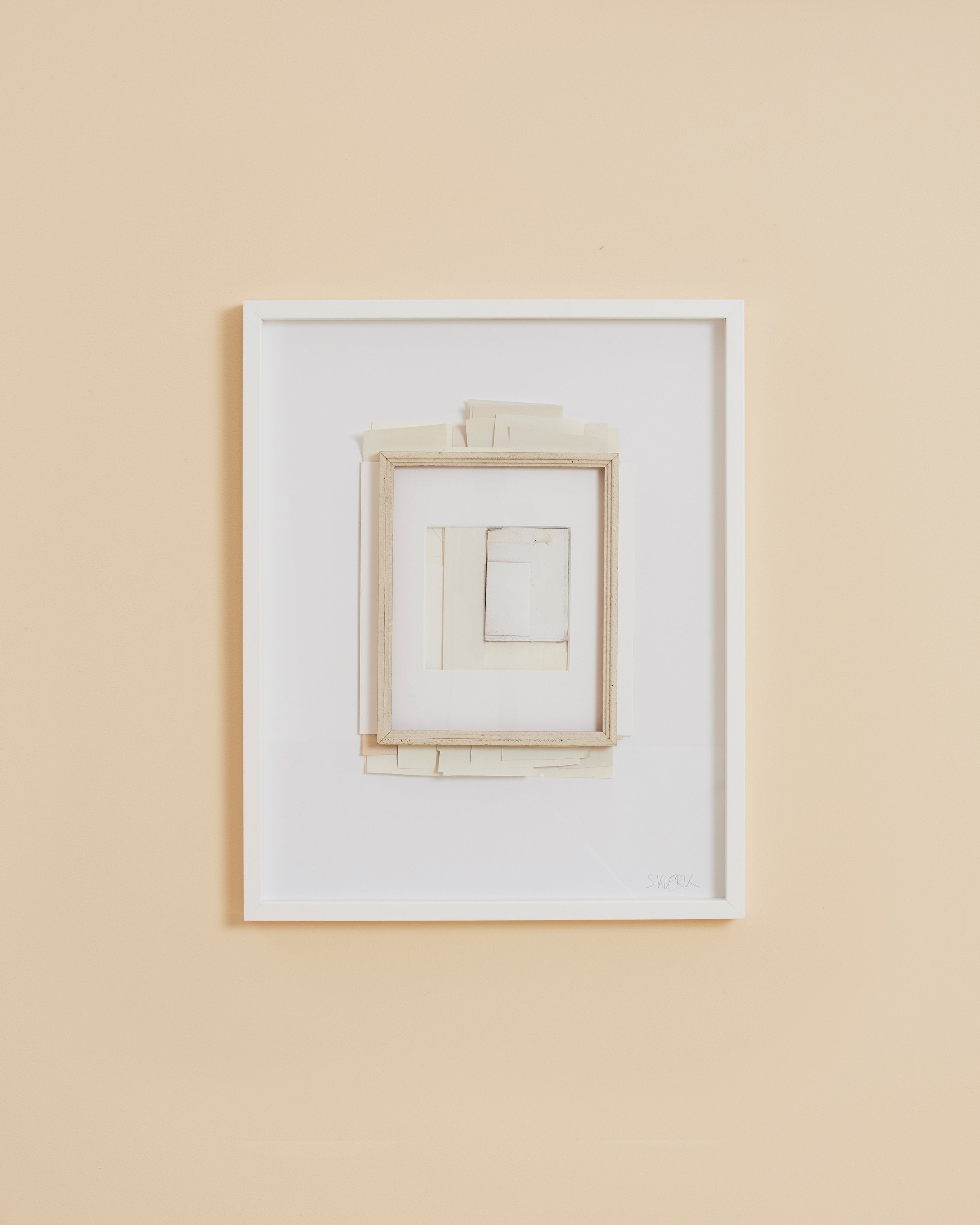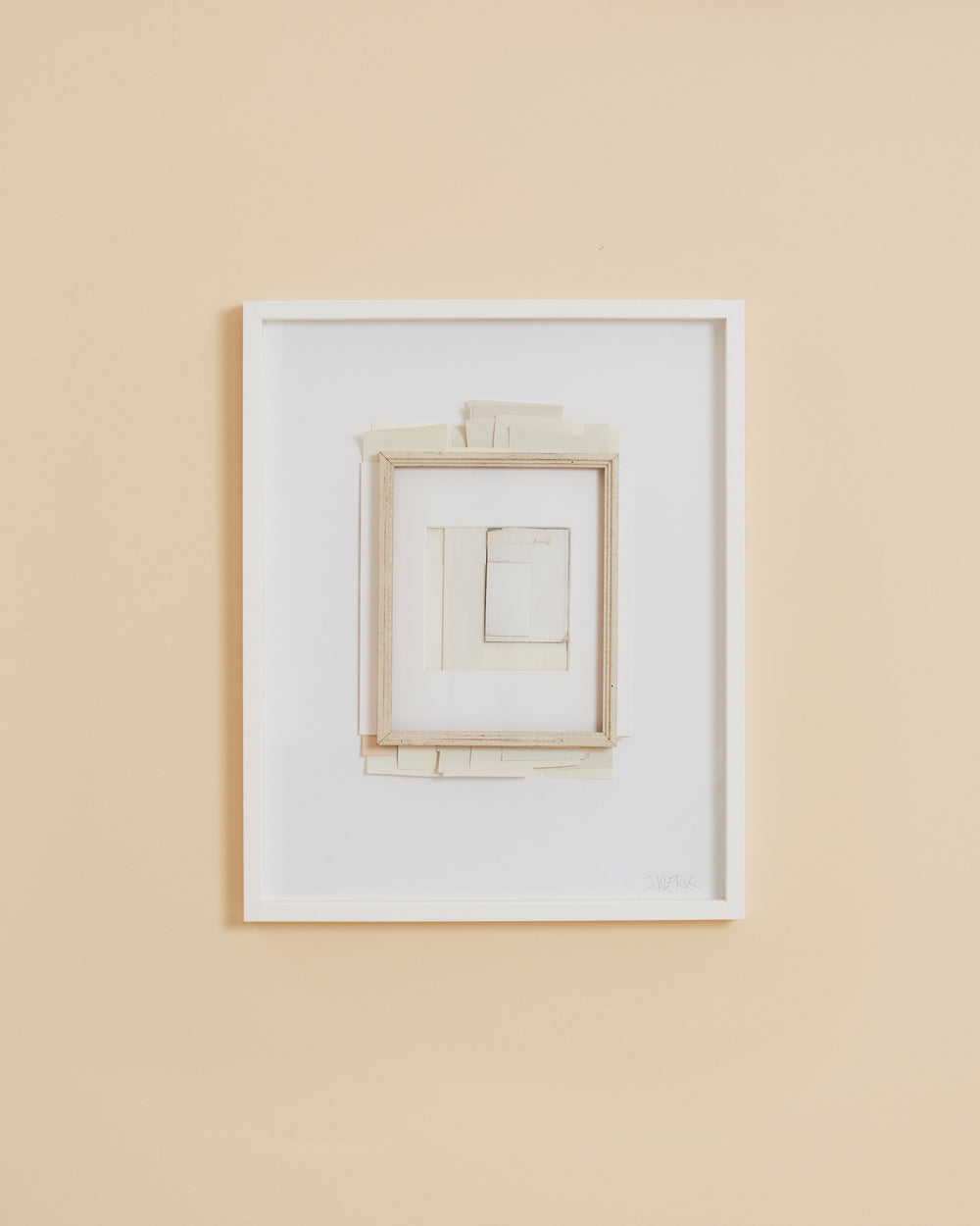 Klerk uses mixed media to create her collages—found paper and objects, sometimes photographs—that she layers and assembles together in abstract graphics rooted in texture and color composition. Created as part of an exclusive series for ARJÉ, White Noise 3 is a mixed media collage of symbolic shapes that embody the ARJÉ philosophy of mind, body and spirit.