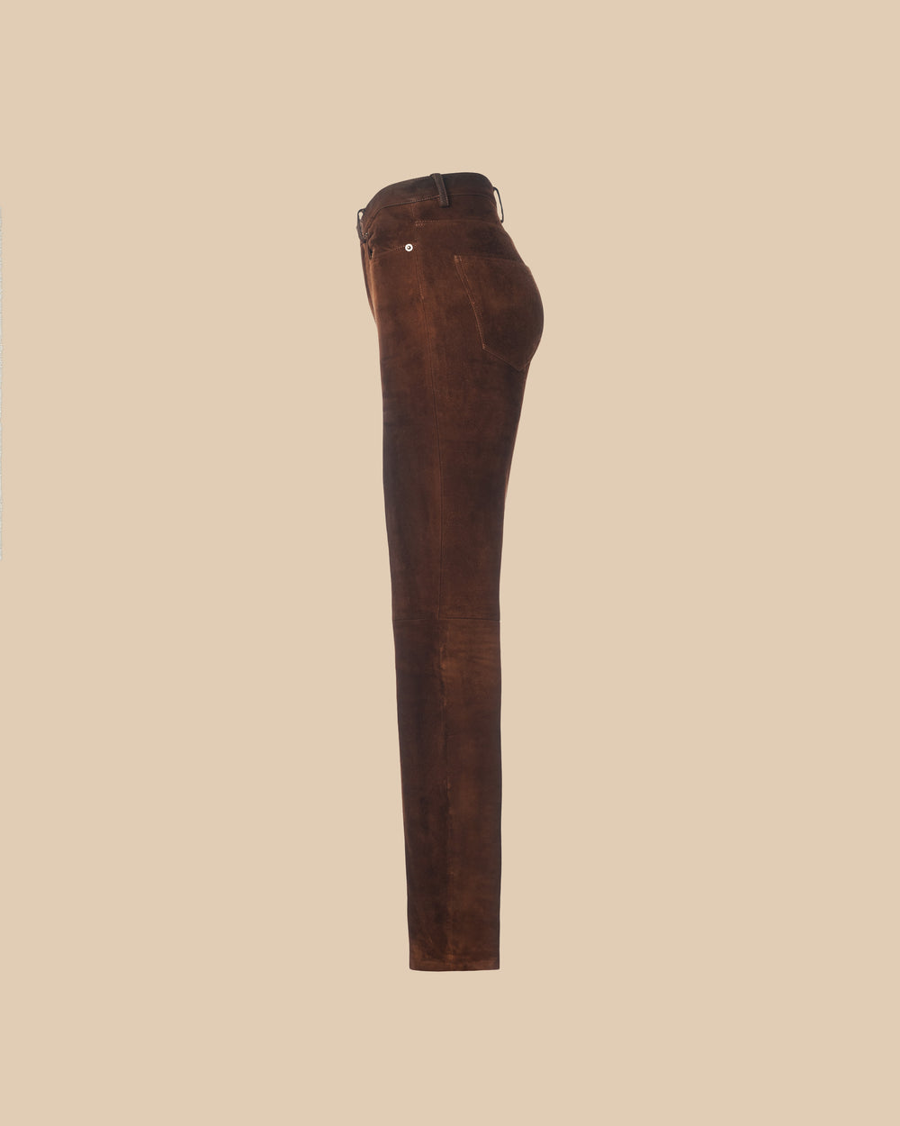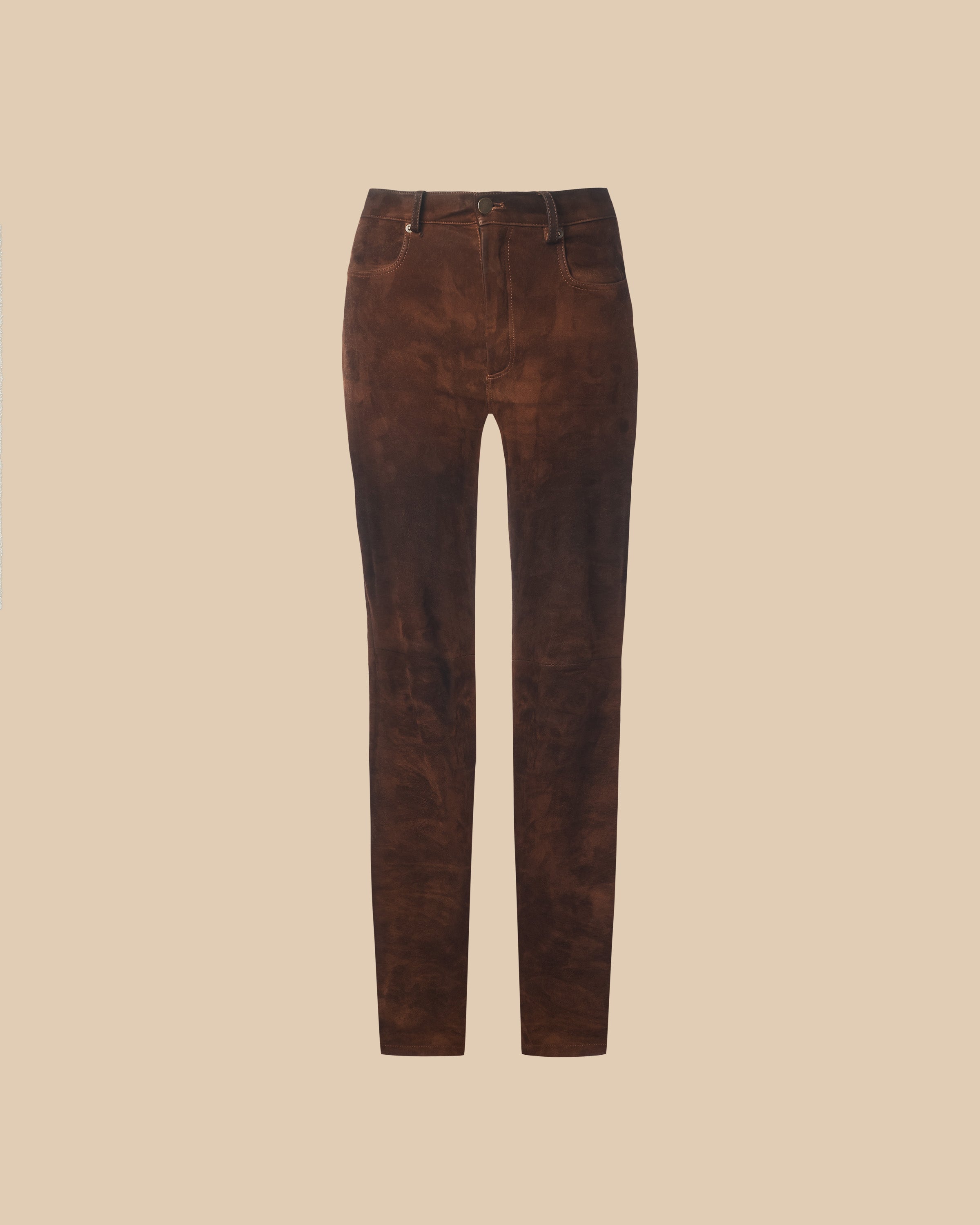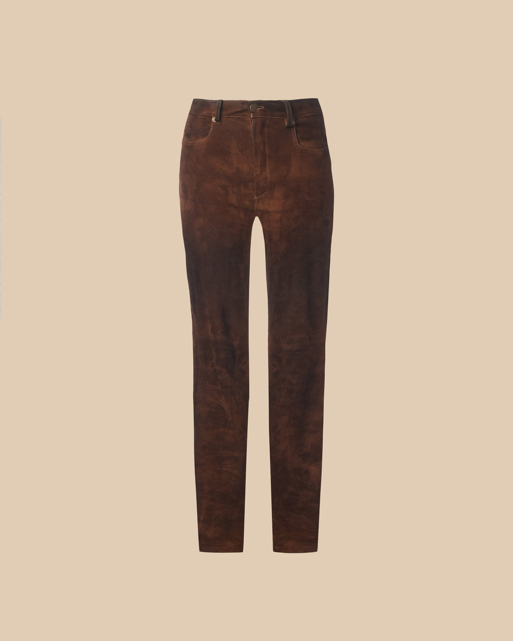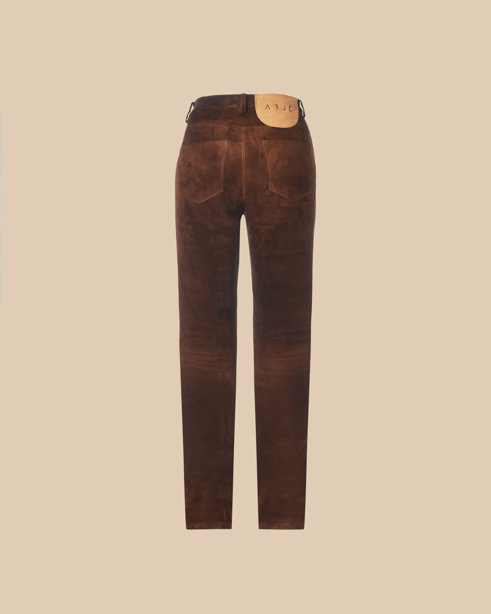 OptionsThe Sadie stretch suede pants in Brunette will become the pair of pants you reach to everyday. The supple stretch suede feels like a second skin that molds to your body. Incredibly comfortable yet intentionally elegant these pants will be your foundational piece as you build your Arjé wardrobe. Details include high rise fit and a longer length in the leg.