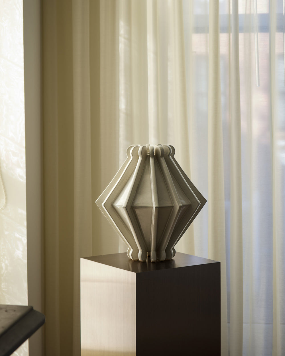 Vessel No. Seven in Ivory by Devin Wilde is a sculptural masterpiece that combines architectural precision with organic forms. This hand-crafted ceramic piece features a complex geometric design with layered ridges and a smooth, matte Ivory finish. Each vessel is meticulously shaped, fired, and finished in Wilde’s Brooklyn studio, ensuring a unique texture and character.
