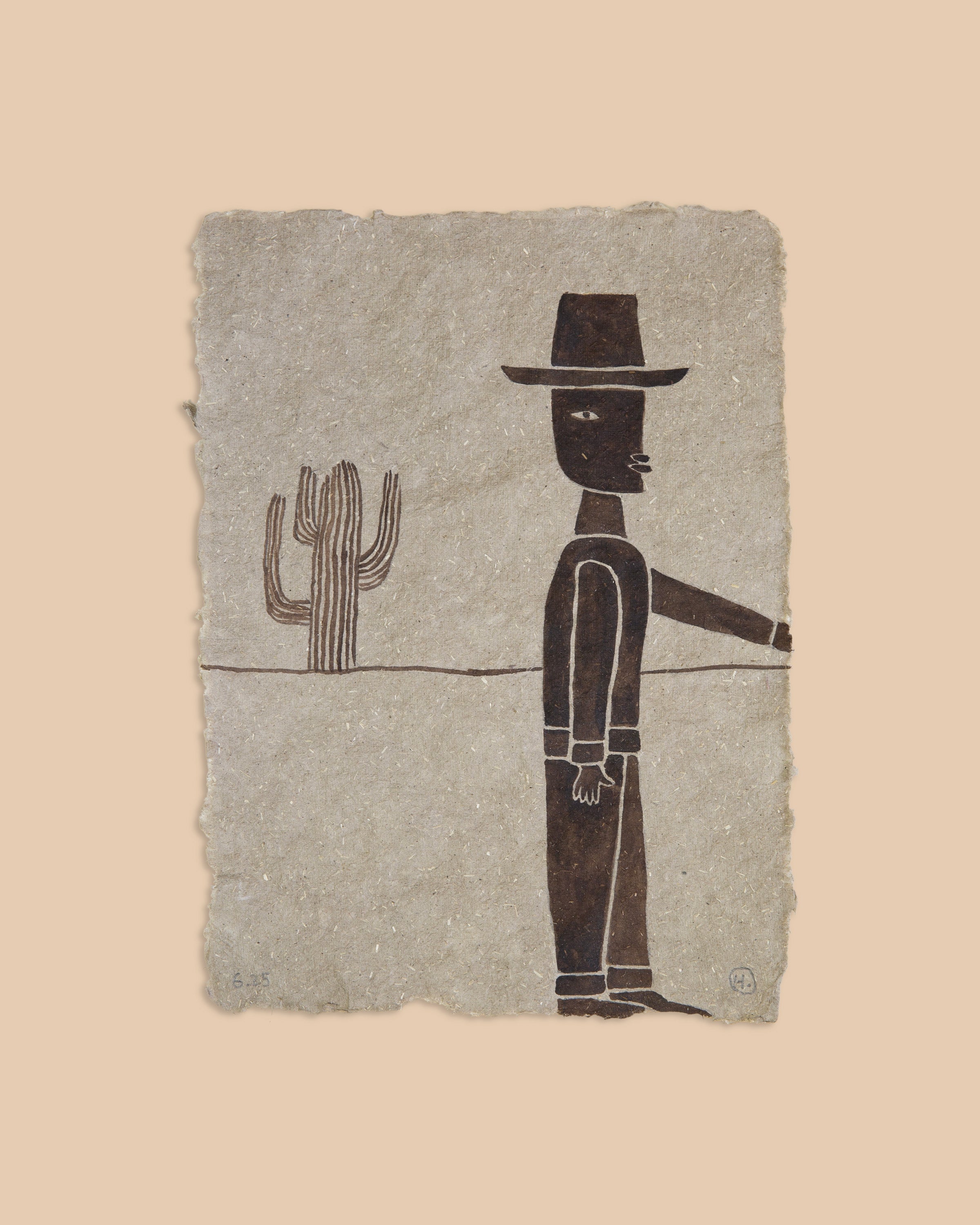 In DON’T BE AFRAID (2025), a lone figure stands in profile beside a desert cactus. Earthy washes meet linen texture, creating a calm, grounded palette of warm neutrals. This intimate, modernist composition brings a sense of stillness and quiet resilience to any wall. For Framing Options please email info@arje.com.