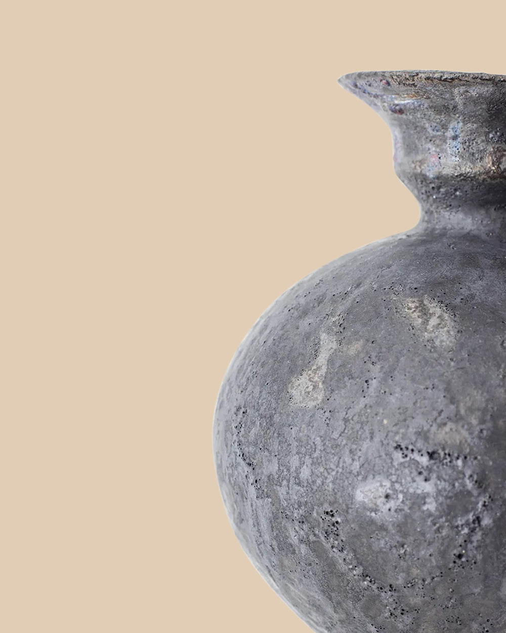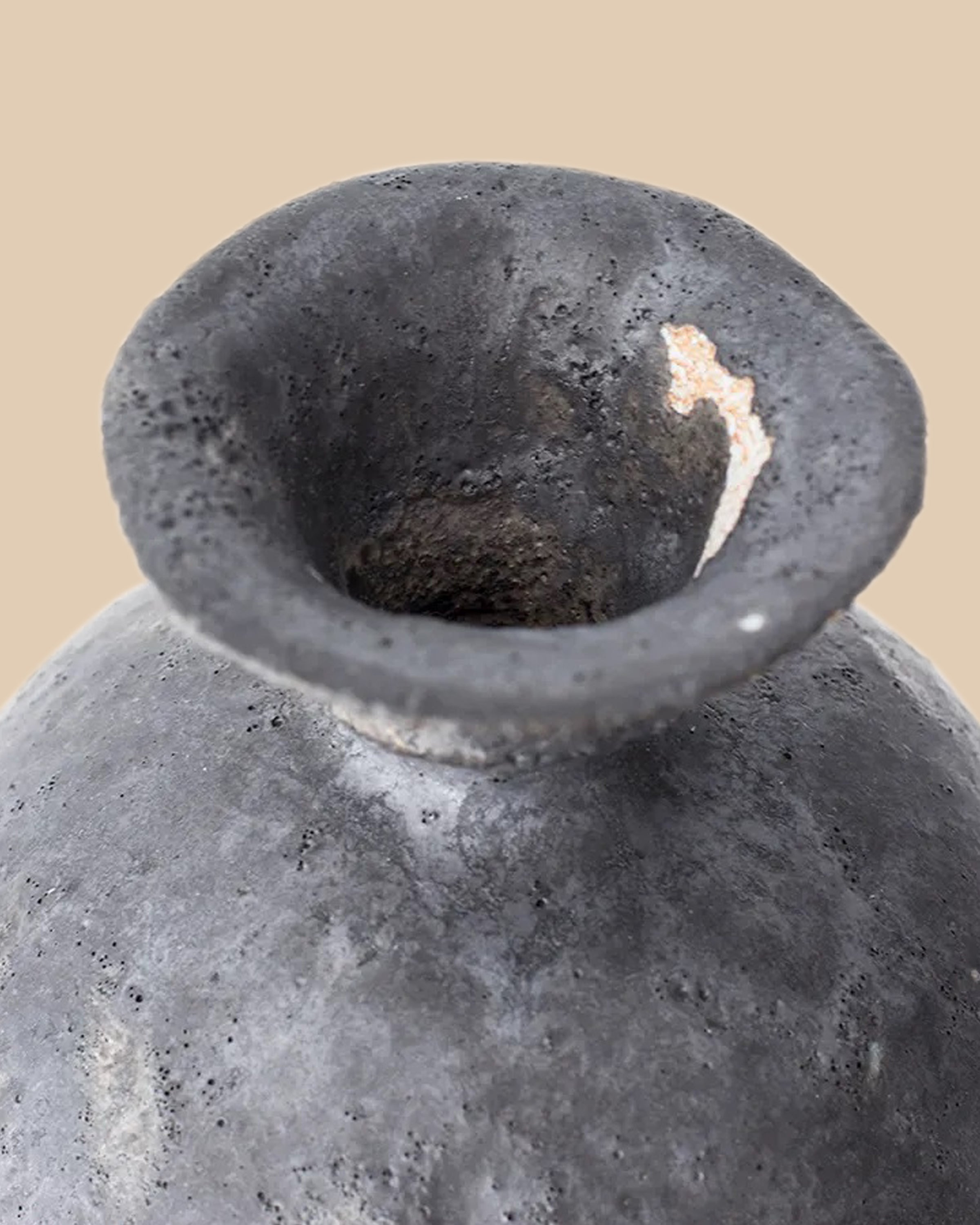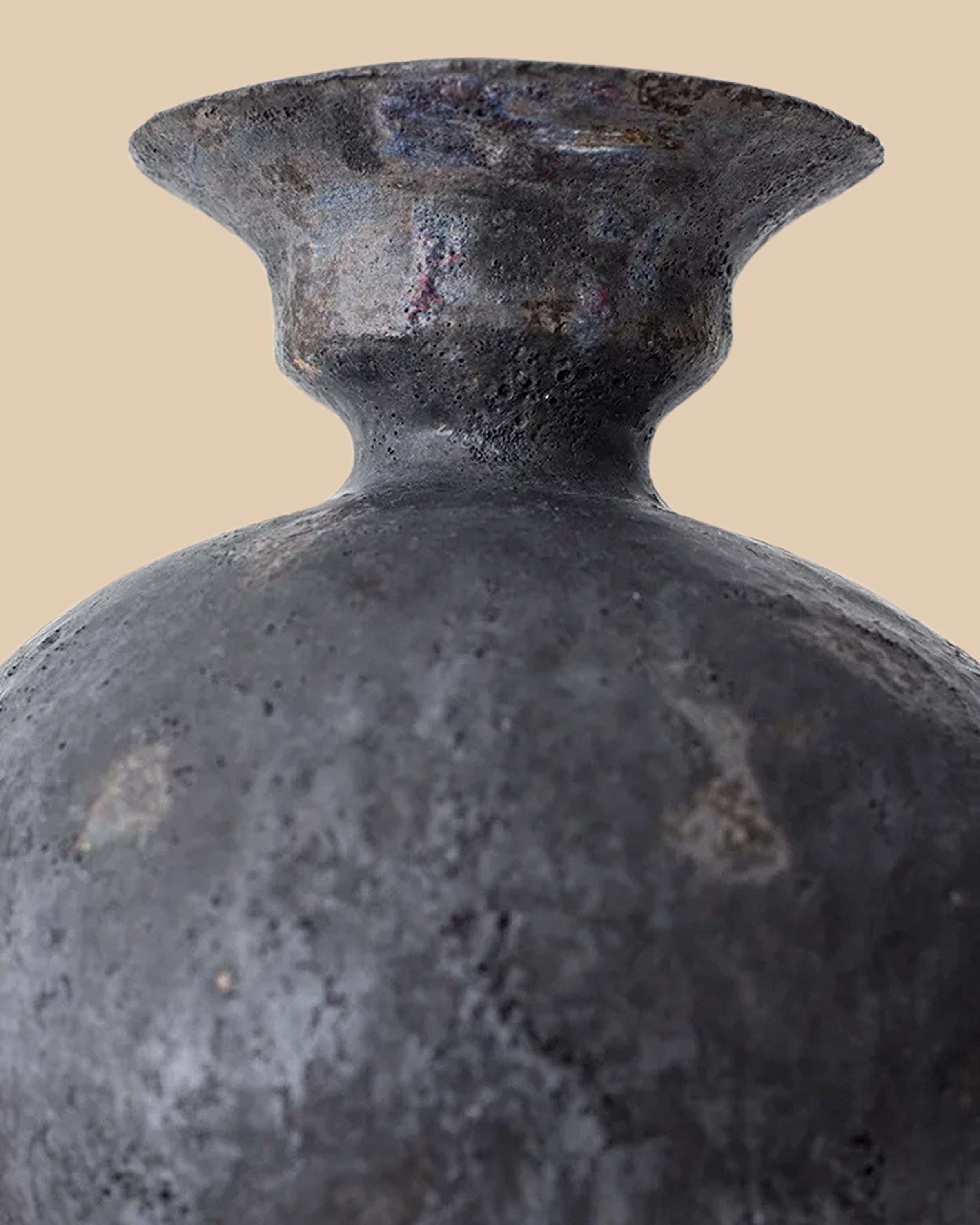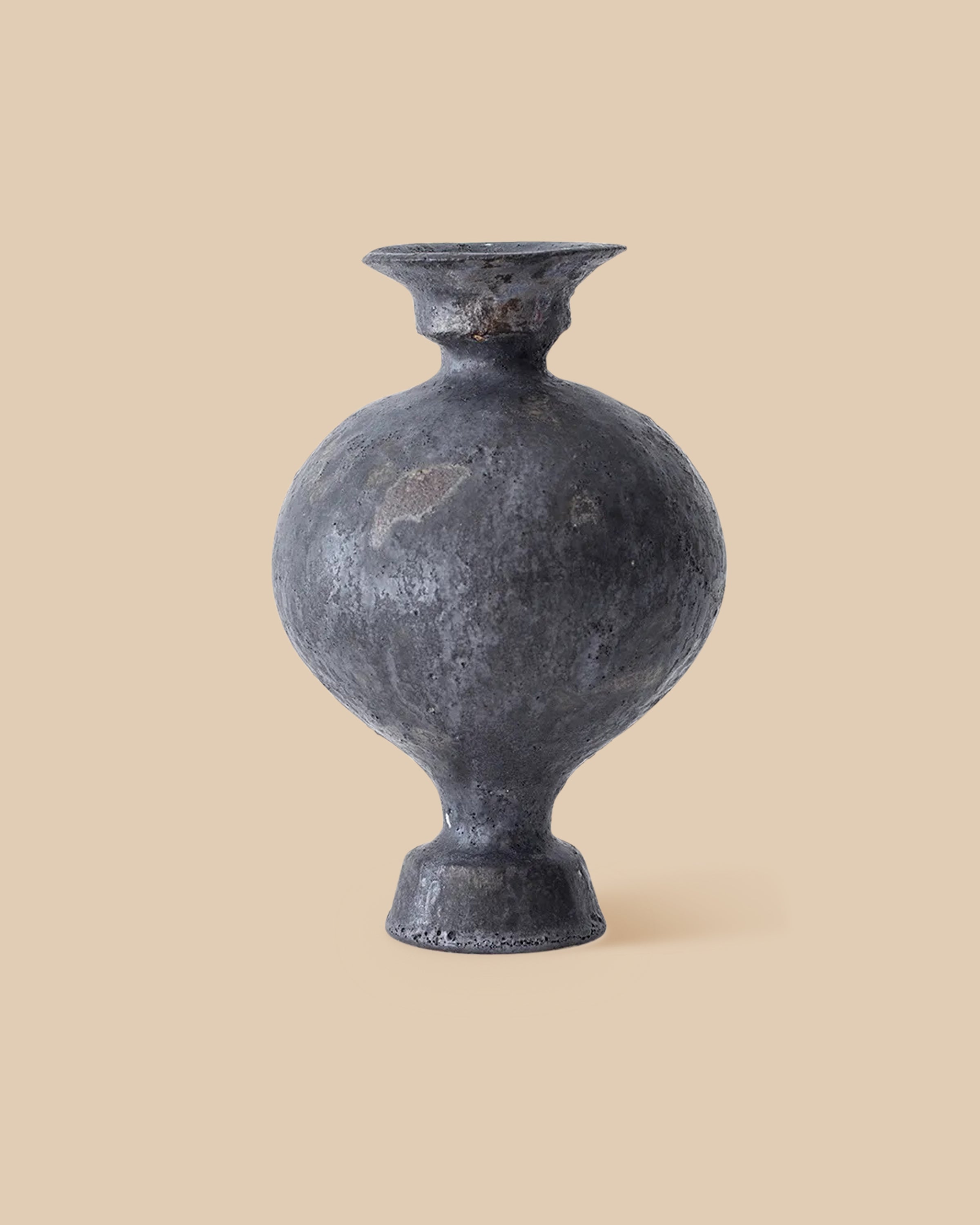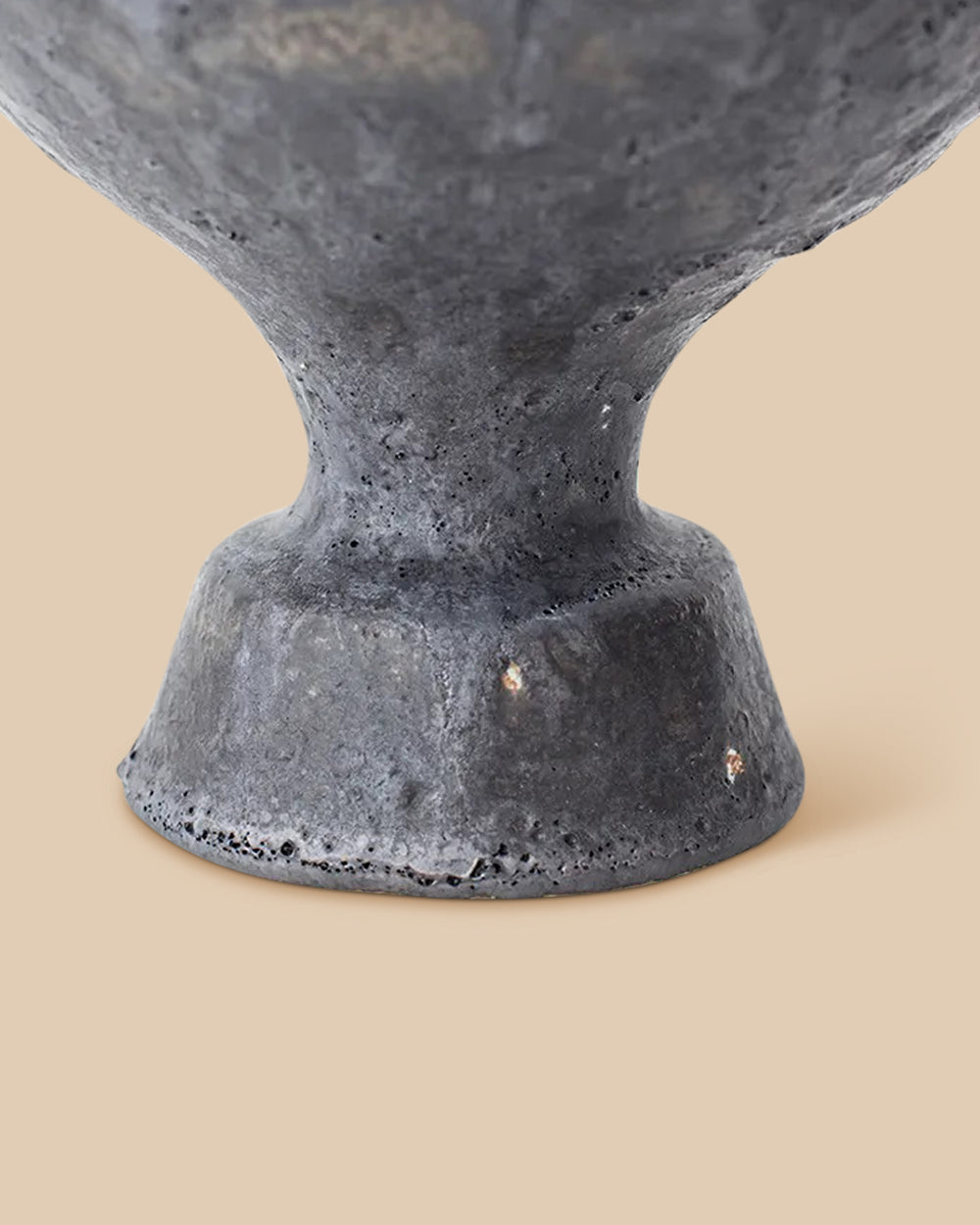 Lekytho is a hand-built, dark-toned functional ceramic vessel capturing the Mediterranean's ancient yet modern essence. This glazed handbuilt vessel is made from stoneware with grog from Manises, Spain and brushed with experimental glazes and a textured surface, resulting in slight variations with each piece. Each piece feels somehow ancient, timeless, and modern at once.