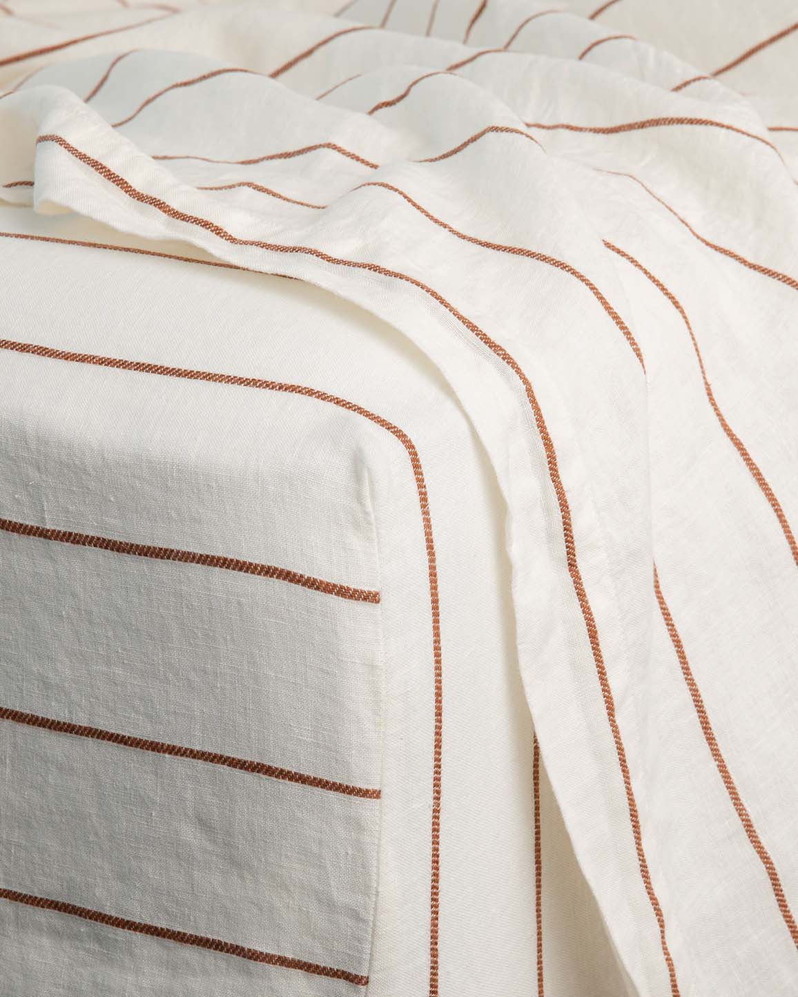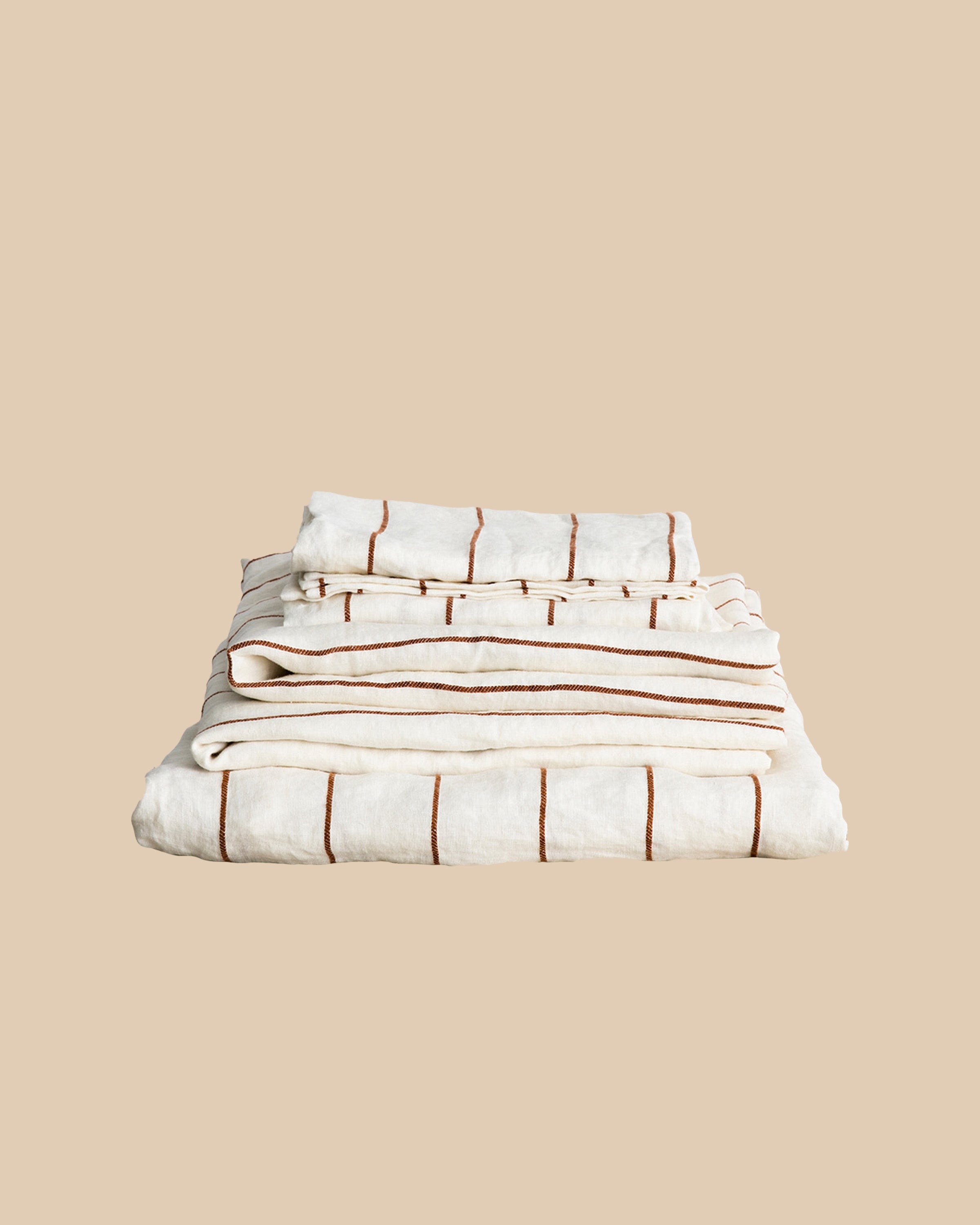 Cultiver weaves their linen bedding from pure European flax, washes it for added softness, and offers a range of beautiful colors that showcase linen's natural texture while bringing warmth and calm to the bedroom.This Cedar Stripe set includes two pillowcases, one flat sheet, and one fitted sheet, and pairs nicely with a solid Cedar contrast.