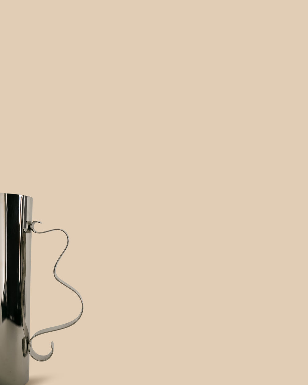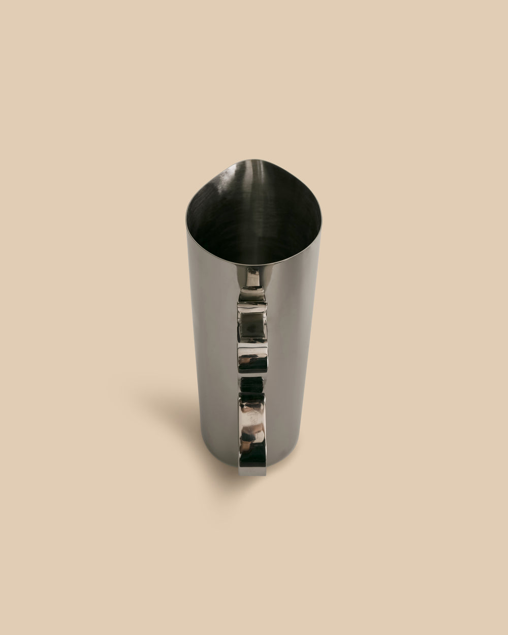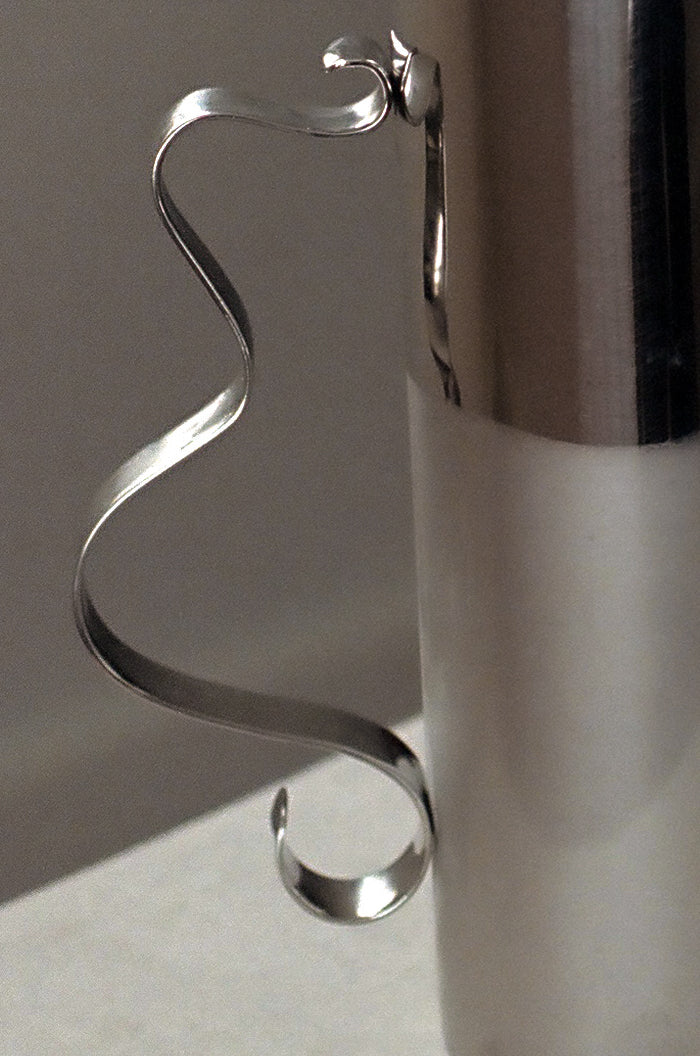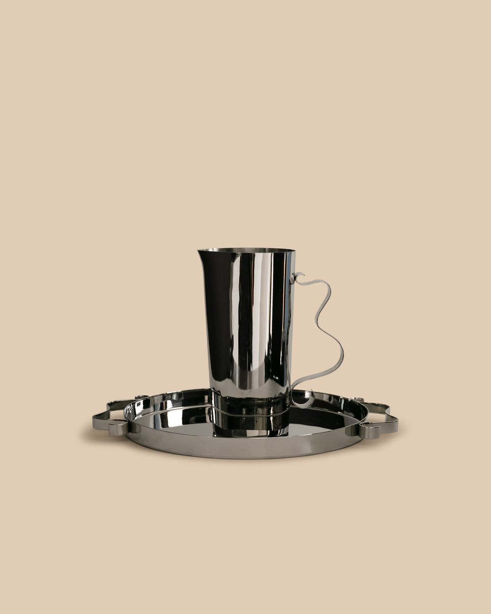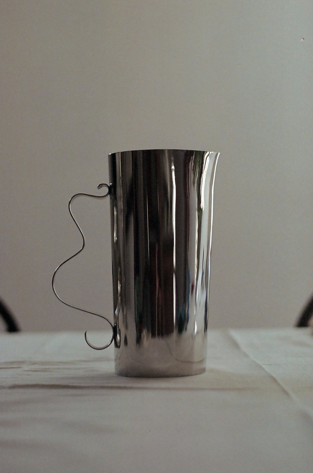 A mirror polished stainless steel pitcher with a soft, wavy, ribbon-like handle. This pitcher is ideal for serving drinks, coffee or tea, or simply as a decorative vase. Pairs beautifully with its sister Squiggle Tray.